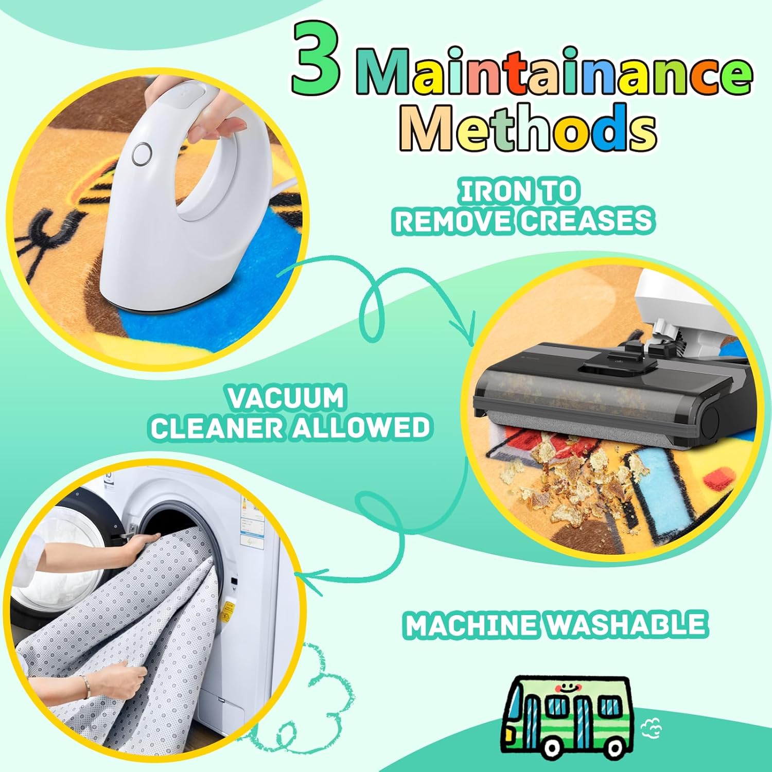 - [Machine Washable Kids Play Rug]: This car rug for kids toy cars measures 5 x 7 feet/60*79 inches. 0.4'' thick. Our mat is easy to clean by vacuum or machine. Perfect bedroom rug, living room rug, and playroom rug.