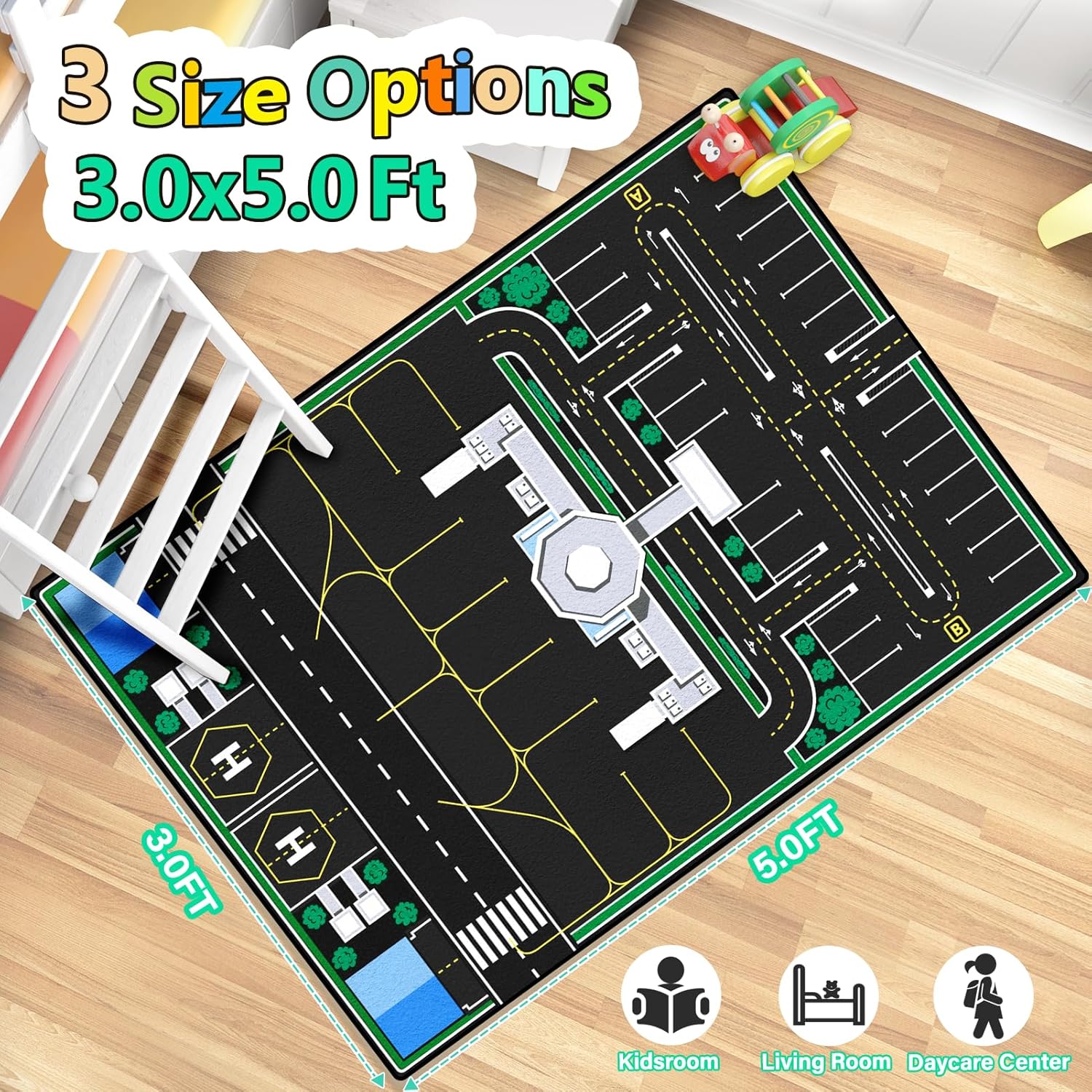 - [Machine Washable Kids Play Rug]This car rug for kids toy cars measures 3 x 5 feet/36*60 inches.0.4'' thick.Our mat is easy to clean by vacuum or machine.Perfect bedroom rug, living room rug, and playroom rug