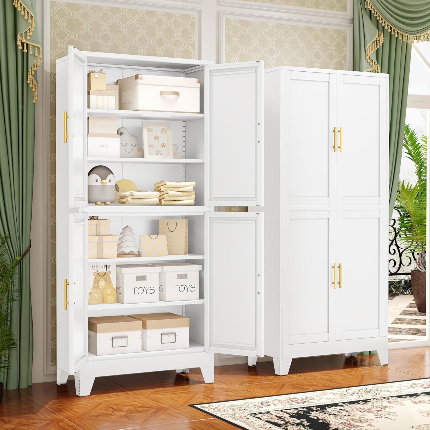 - ăâMultifunctional CabinetăMetal pantry are perfect for various environments and are an ideal choice for home offices, bedroom, livingroom, kitchen, study and more. You can use it as a pantry cabinet, food cabinet, kitchen cabinet, kitchen cupboard, utility cabinet, laundry room cabinets, bathroom cabinet, bedroom wardrobe, bookcase, tool cabinet, file cabinet, appliance cabinet, etc. Of course, you can also use it for any place you want to place it