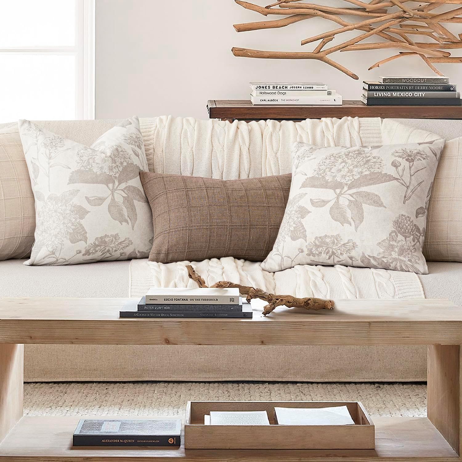 Foindtower Set of 2 Linen Floral Vintage Throw Pillow Covers Neutral Accent Decorative Cushion Covers Farmhouse Boho Home Decor for Sofa Chair Couch Bedroom Living Room Outdoor,22×22 Inch,Tan Beige
