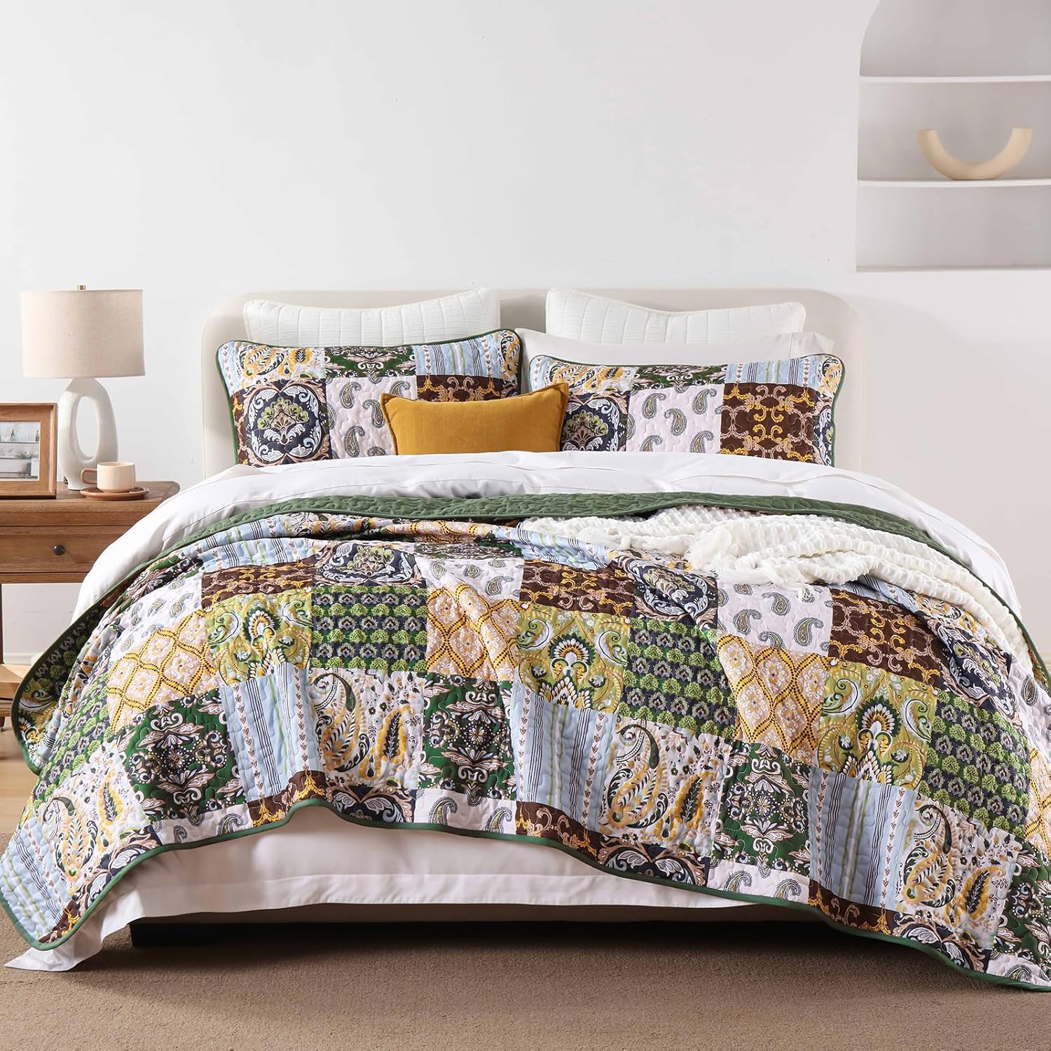 - BOHO QUILT SET: The bedspread queen set features an amazing patchwork plaid design, Combined with bohemian stripe damask and paisley pattern. This quilt bedding set will effortlessly transform your bedroom into an elegant space!