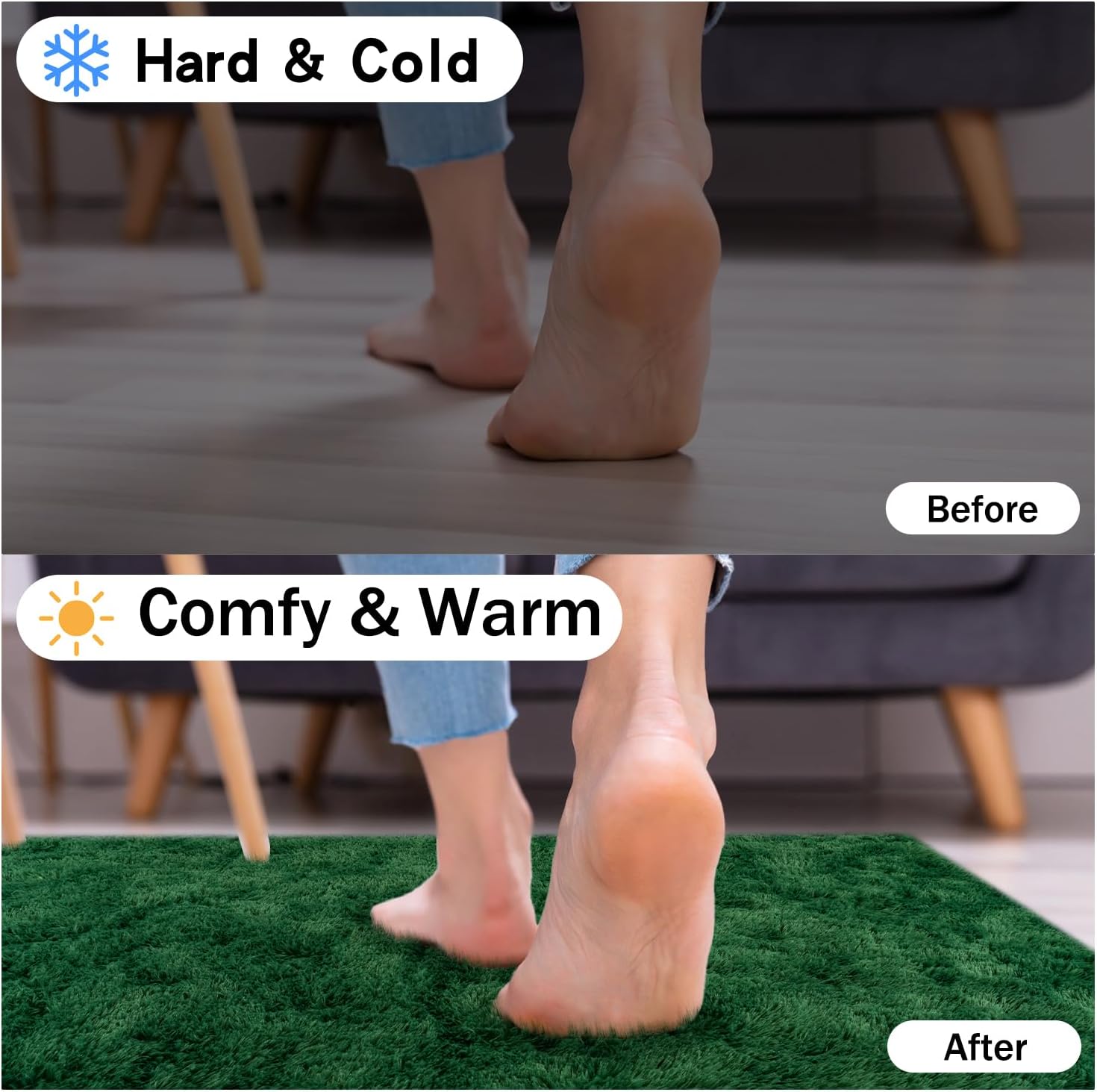 - Rezutan Area Rugs-Soft Fluffy Rug:The Rezutan shag area rug is crafted from durable microfiber, ensuring a plush and incredibly comfortable experience. Its 1.7-inch high pile surface is dense and velvety to the touch, while the 0.3-inch memory foam provides superior cushioning, isolating you from the cold ground and offering soundproofing benefits. Because of the plush fur on the Soft Fluffy rug, youโll feel like walking on the clouds when walking barefoot on the large bedroom rugs.