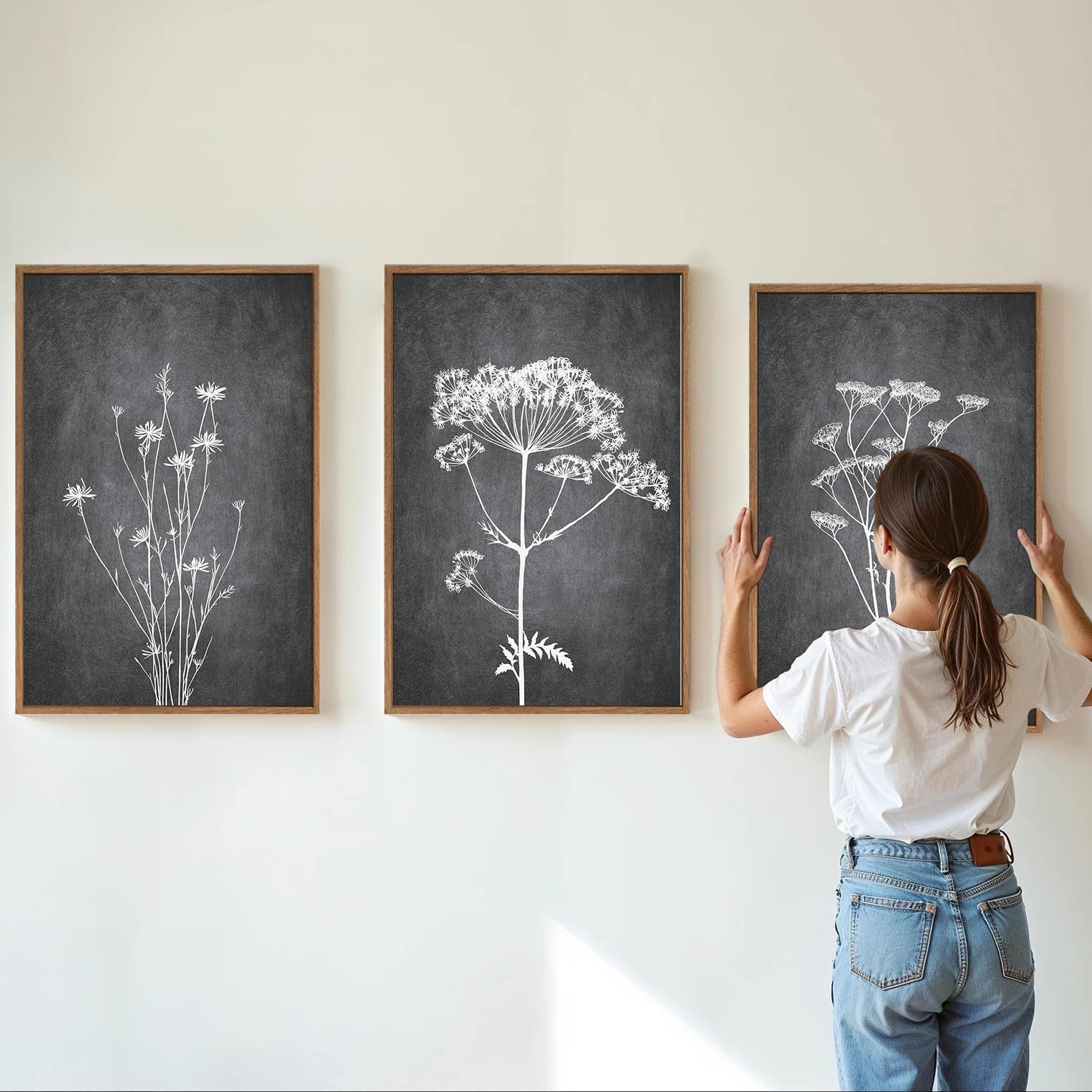 Tinonedraw Black and White Botanical Framed Canvas Wall Art Set, Vintage Floral Wall Decor, Dark Academia Minimalist Plant Art Paintings, Abstract Wildflower Art Print for Living Room Bedroom 16"x24"x3