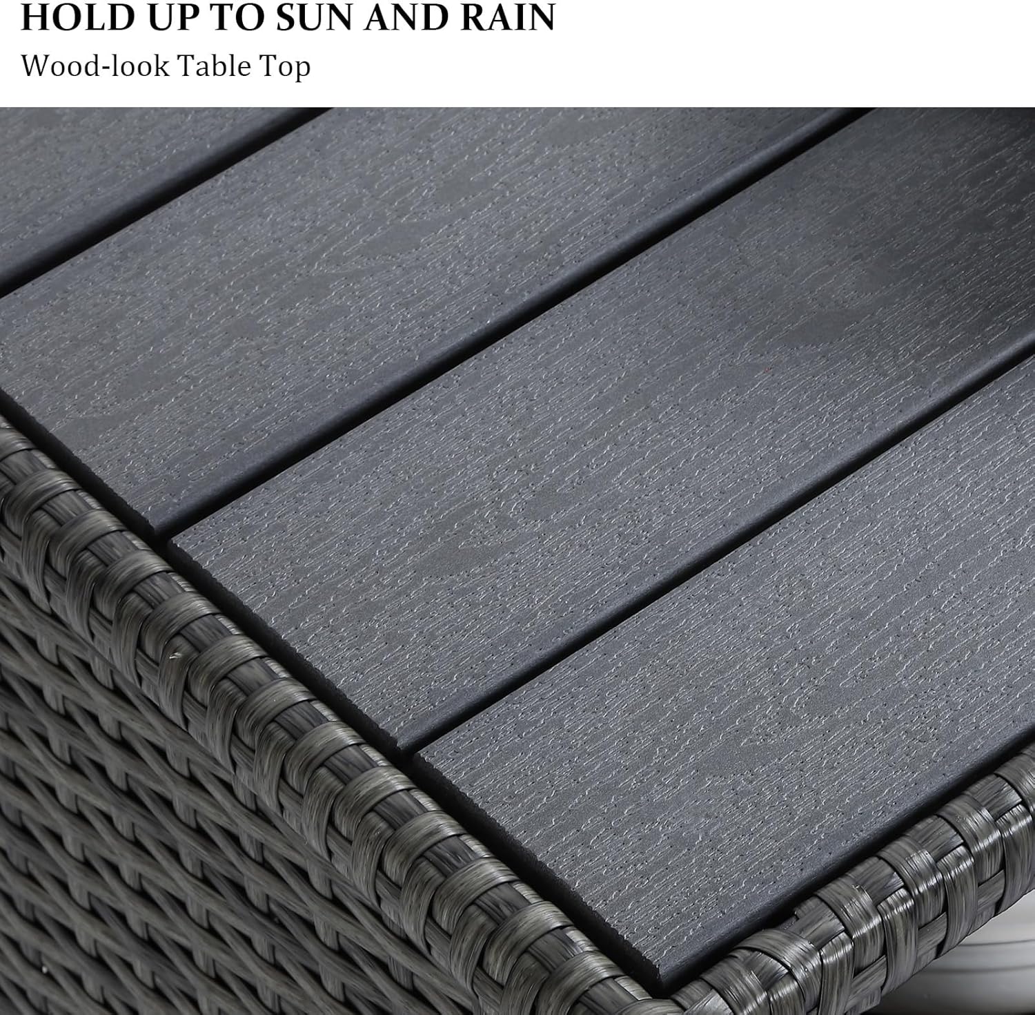 - Resin Faux Wood Top: Wicker Outdoor Bar Table with resin wood Tabletop, that mimics the look and feel of real wood.The resin wood top surface makes cleaning a cinch β a quick wipe with a damp cloth is all it takes. The sturdy steel frame of wicker storage cabinet that has been specially treated to withstand potential corrosion over time