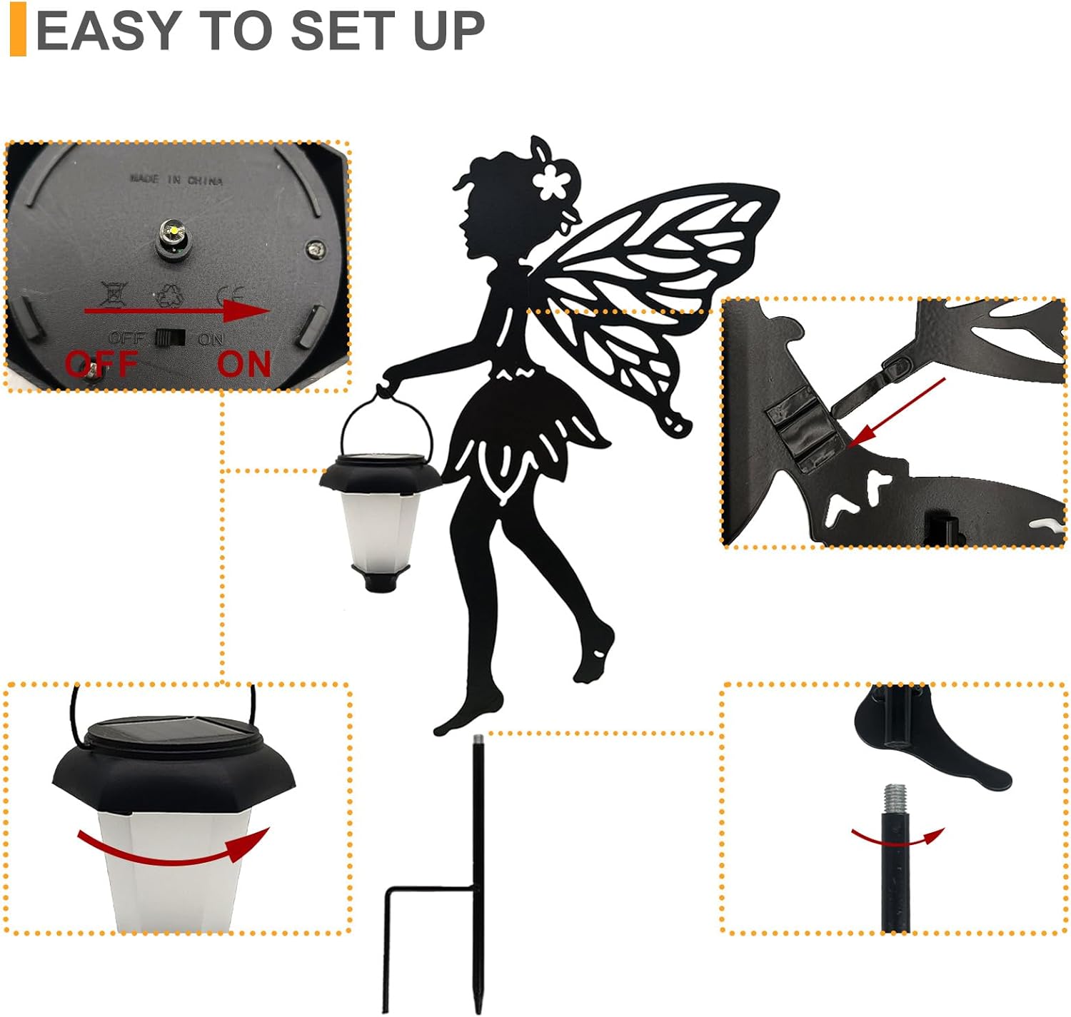 - Easy to Use: No additional tool is required, just screw the ground stakes and fairy statues together by hand, Then attach wings to the fairy statues and hang the light. Simply insert them in a sunny location and you will enjoy your garden ornament