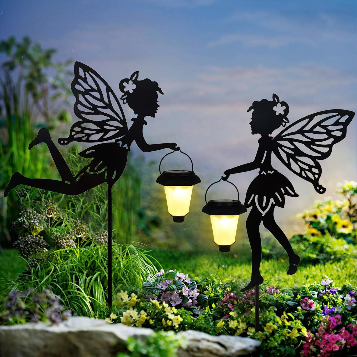 - Unique Fairy Garden Stakes: One set includes two cute fairy statues with garden stakes. They feature a captivating design. Each charming garden angel statue holds up solar lantern in her hand. Add a touch of fairy-tale charm to your garden with them