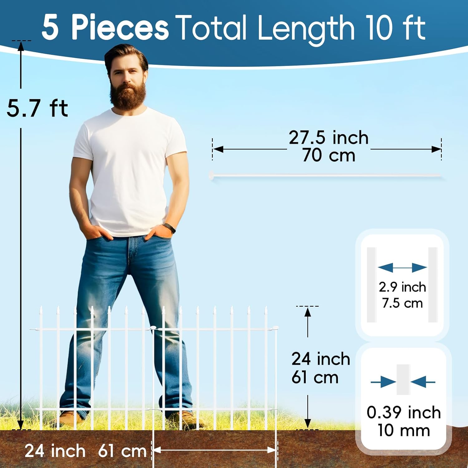 - 【Sturdy and Durable】This metal garden fence is made of 10mm diameter wrought iron welded together and covered with a white rust-resistant coating that won't rust easily. Compared to wood fences and plastic fences, it requires no frequent maintenance, is fearless of insect bites and corrosion, effectively withstands harsh weather, and is durable.