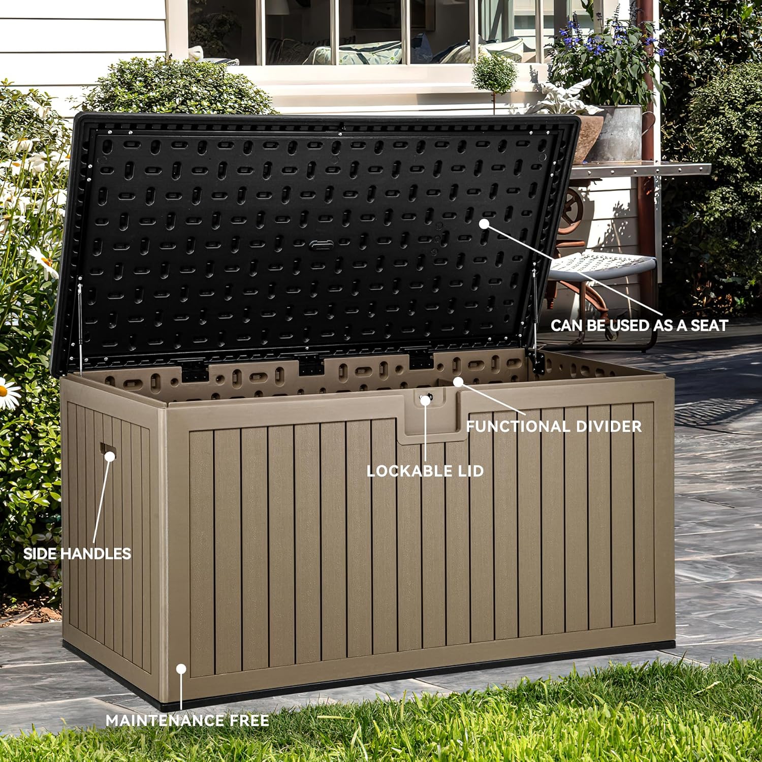 - Double-layer Structure: This deck box features a double-layer design that maximizes durability and strength, while the wood grain texture complements any decor; Made from weatherproof resin thatโs rust-resistant, corrosion-resistant, and maintenance-free