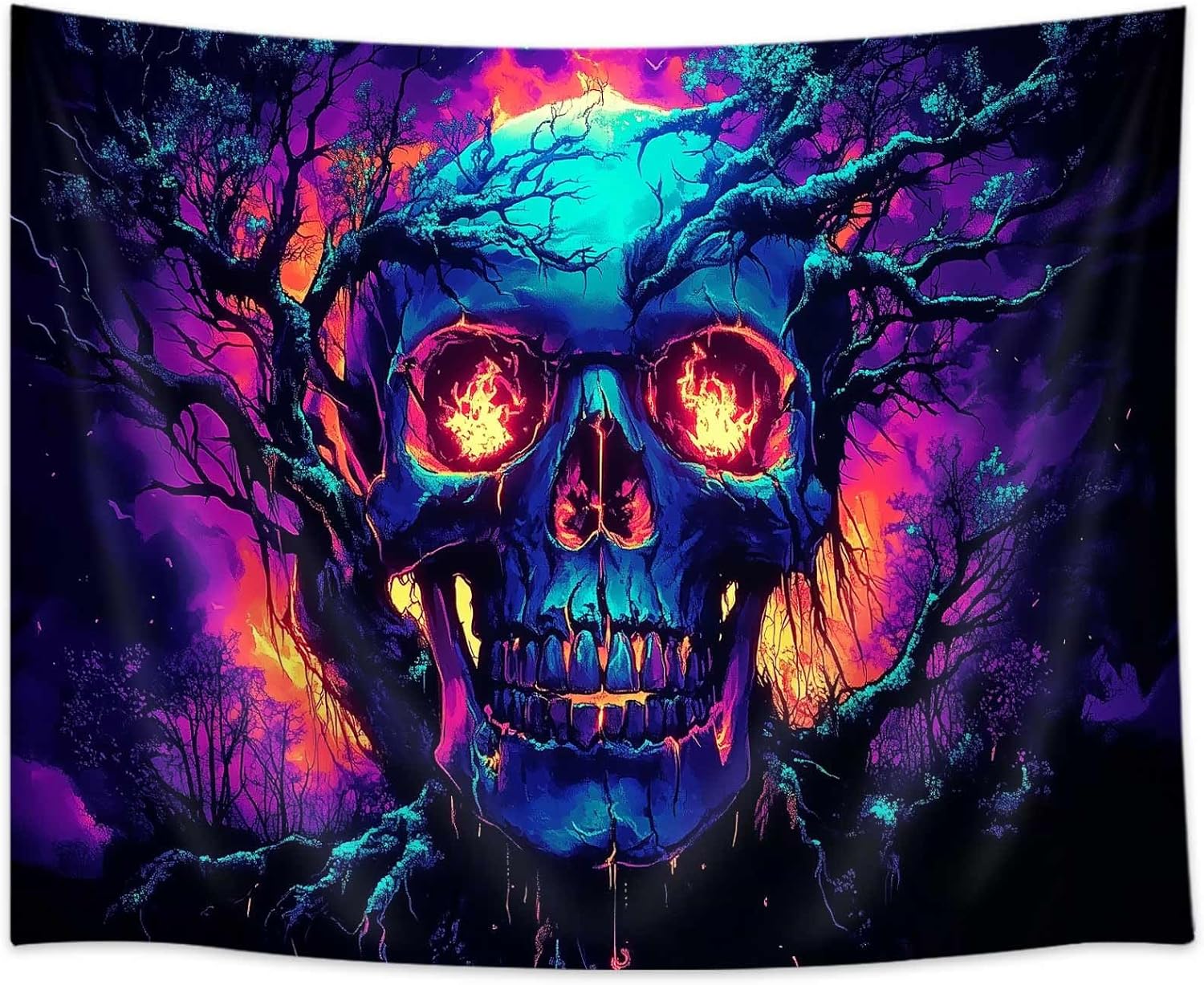 Xiaoput Blacklight Fire Skull Tapestry for Bedroom, Trippy UV Reactive Burning Skeleton Forest Wall Hanging Tapestries, Scary Dark Horror Glow in the Dark Tapestries for Living Room Home Dorm 90X70IN