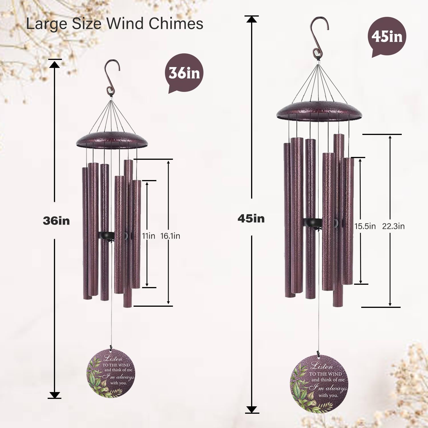 • LARGE OUTDOOR WIND CHIMES: Our large wind is available in 36" and 45" sizes. They are made of bronze metal with a waterproof and anti-corrosion coating and can be hung in the yard for a long time. They can easily decorate the backyard, garden, window, terrace, or living room.