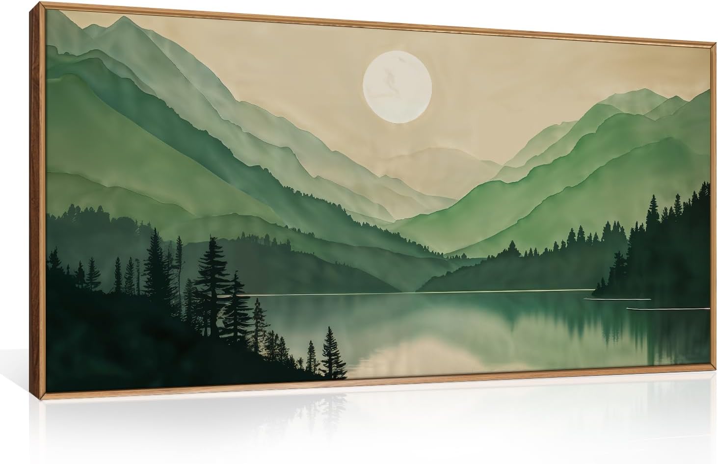 Celestdeco Watercolor Mountain Framed Canvas Wall Art Set, Boho Sun Forest Wall Decor, Green Scenery Wall Painting, Modern Woodland Artworks for Living Room, Bedroom, Dining Room, Office - 20" x40x1