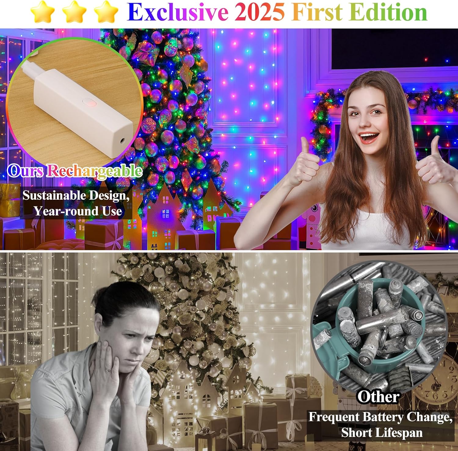 - 2025 Specially Developed Battery String Lights: Say goodbye to disposable batteries and embrace sustainability! Our rechargeable Type-C power bank (cable included) powers the twinkle lights for 30+ hours of cordless glow. When it’s time to recharge, simply detach the compact, lipstick-sized power bank—no need to move the entire string lights. Designed with an innovative, patented structure, this power bank offers a smarter, greener way to shine