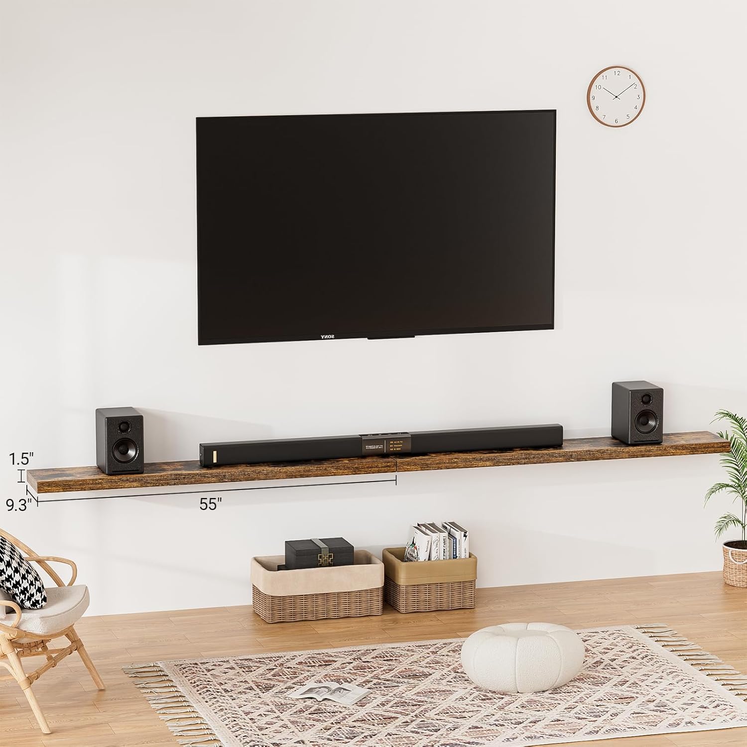 - ăLonger DesignăOur pretty wall shelves are 55"W x 9.3"D x 1.5"H.Our brown floating shelves is longer than traditional designs and can hold more items.The rustic brown floating shelves optimize wall space,helping organize essentials without taking up floor space in your home.