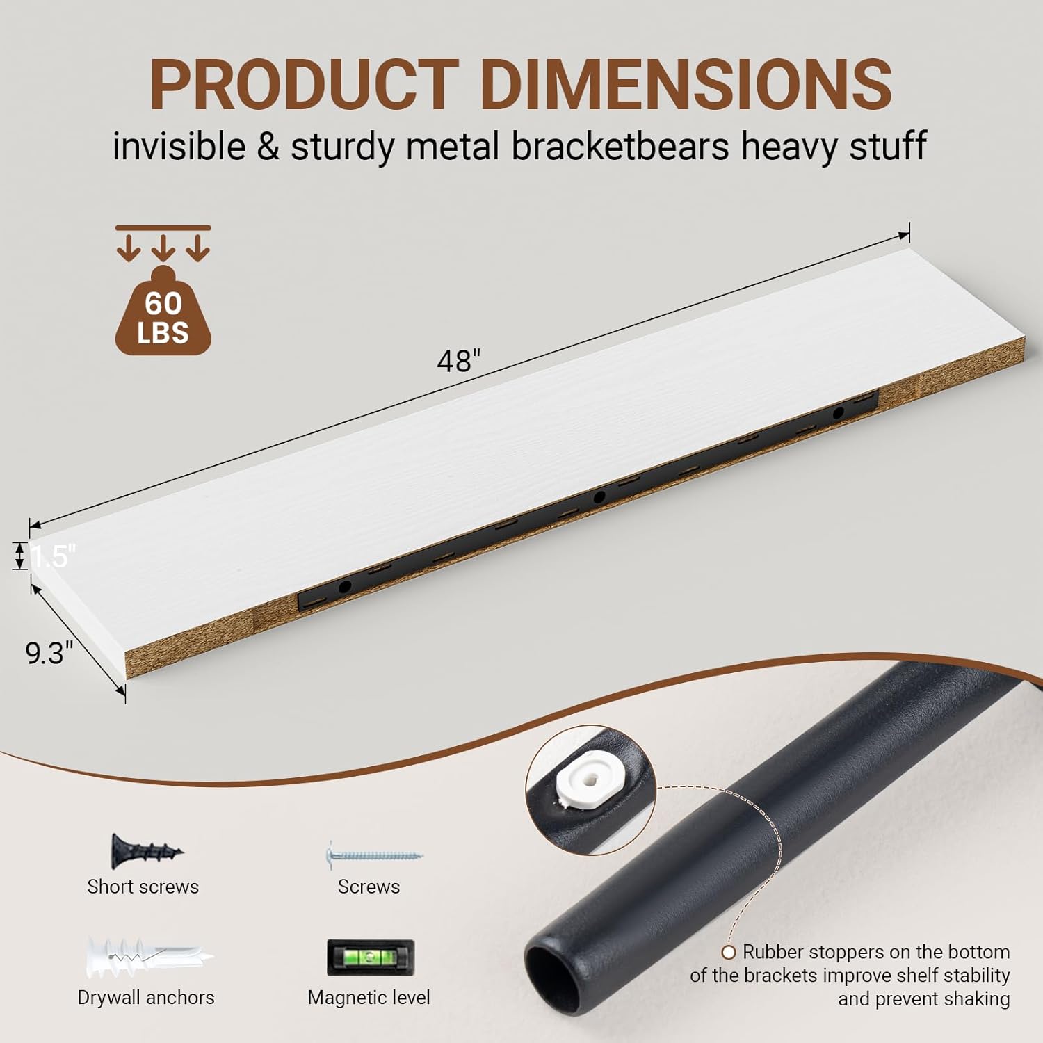 - ăLonger DesignăOur pretty white floating shelves for wall are 48"W x 9.3"D x 1.5"H.Our wall shelf is longer than traditional designs and can hold more items.The white floating shelf optimize wall space,helping organize essentials without taking up floor space in your home.