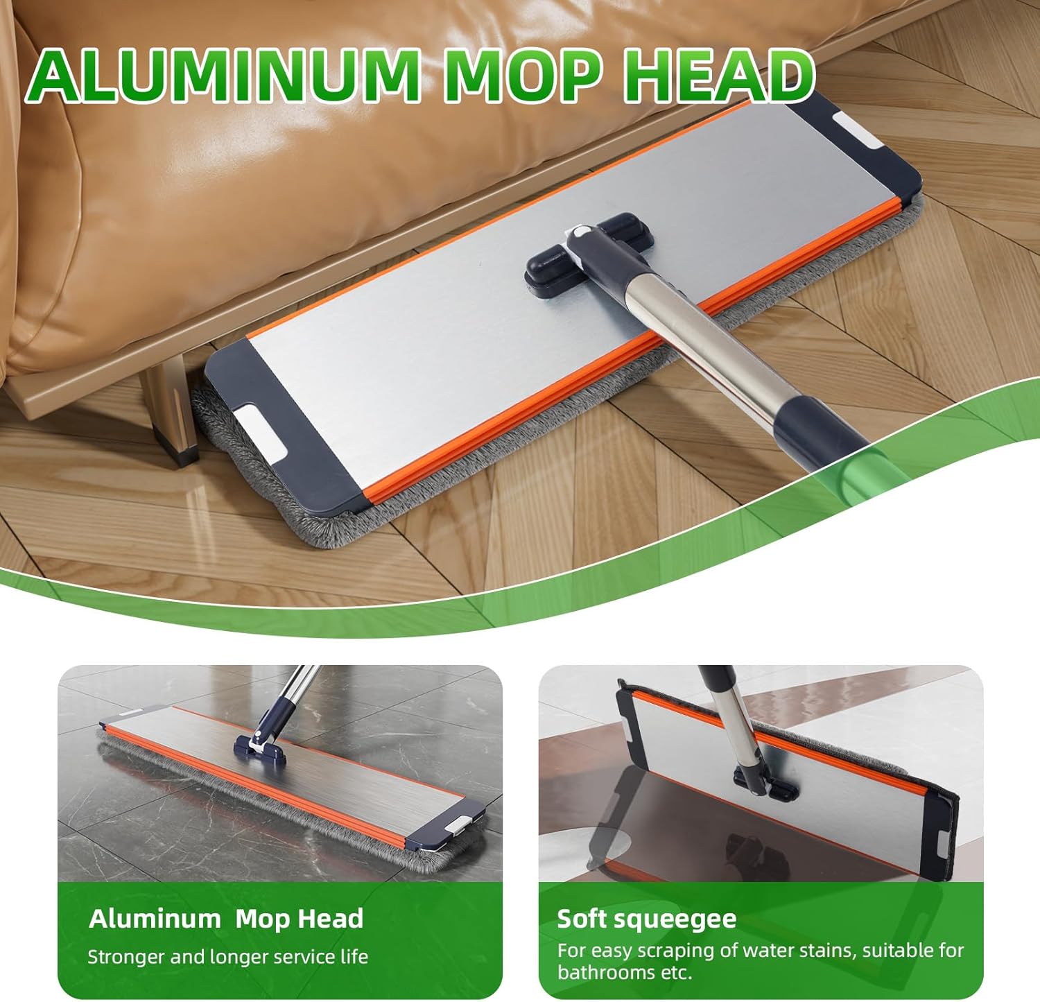 - 360° Mop Head – The mop head rotates a full 360°, allowing for smooth and flexible cleaning of hard-to-reach corners, edges, and areas under furniture. Perfect for all types of floors, including hardwood, laminate, and tile. Aluminum alloy mop head has a longer service life.