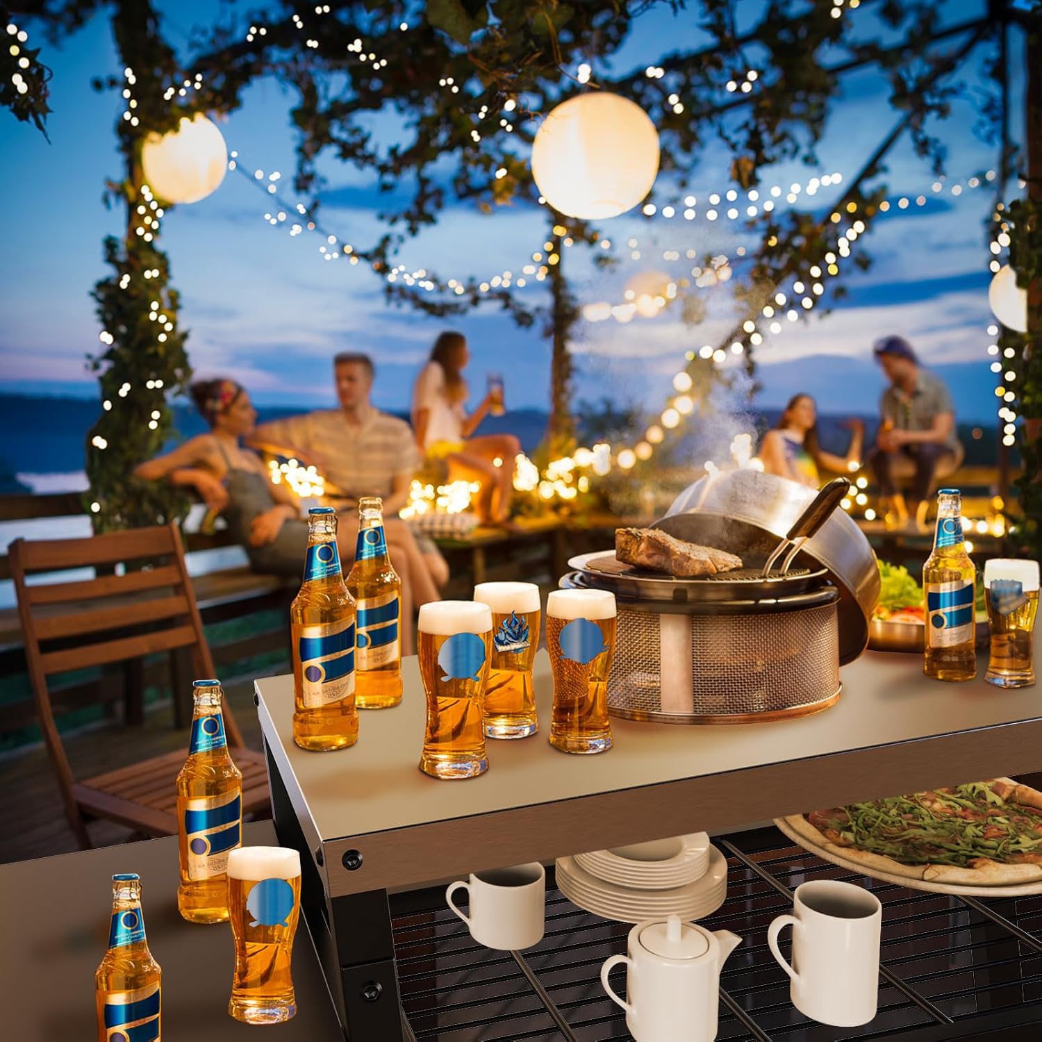 - Heavy Duty Outdoor Grill Cart: This grill table is crafted from premium stainless steel, renowned for its durability and sturdiness, making it an ideal choice for outdoor use.It features a stainless steel construction that not only enhances the aesthetic appeal of your pizza oven table but also provides excellent rust resistance, capable of withstanding various harsh weather conditions