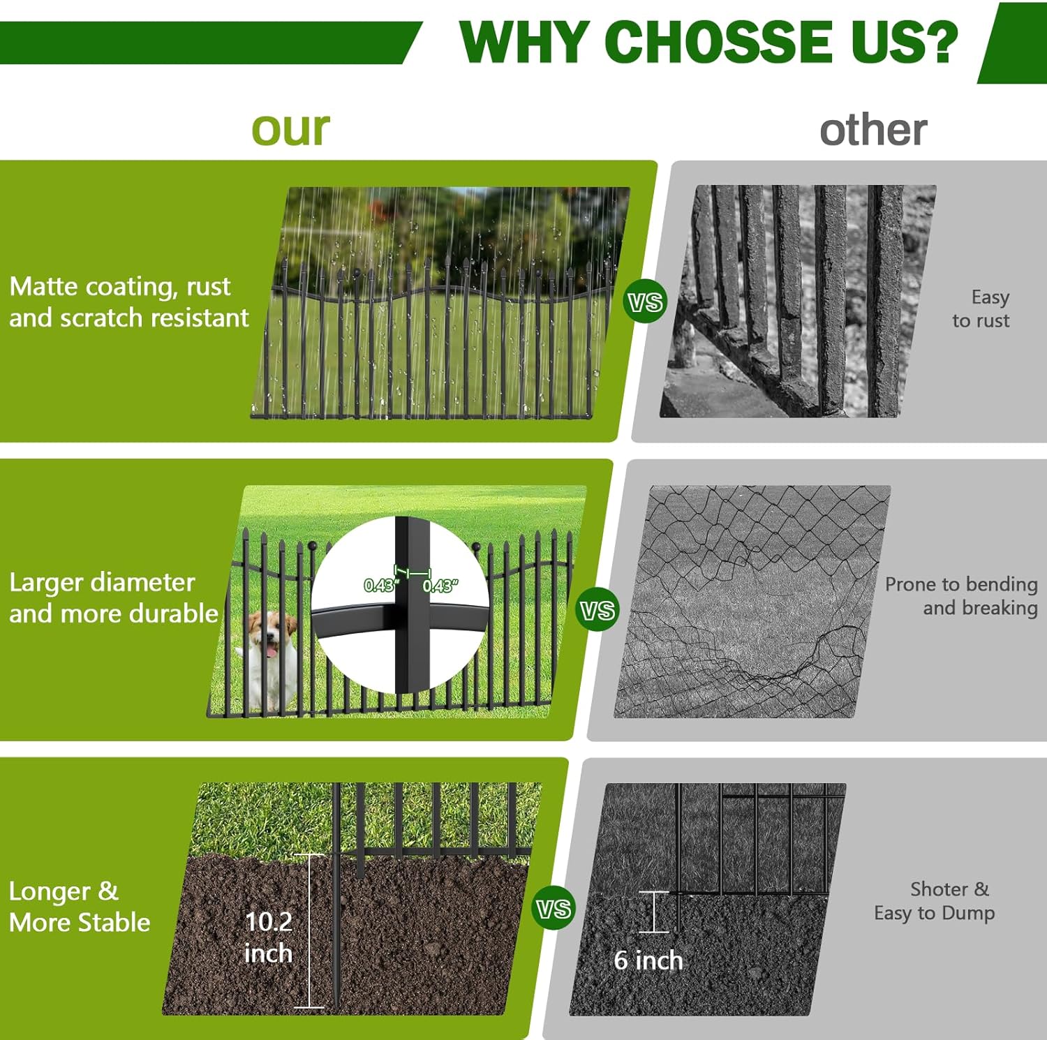 - 【Rustproof & Weather-Resistant】Coated with a corrosion-resistant finish, this fence resists rust, moisture, and harsh weather. The reinforced metal construction stays intact even in extreme conditions, ensuring years of reliable use.