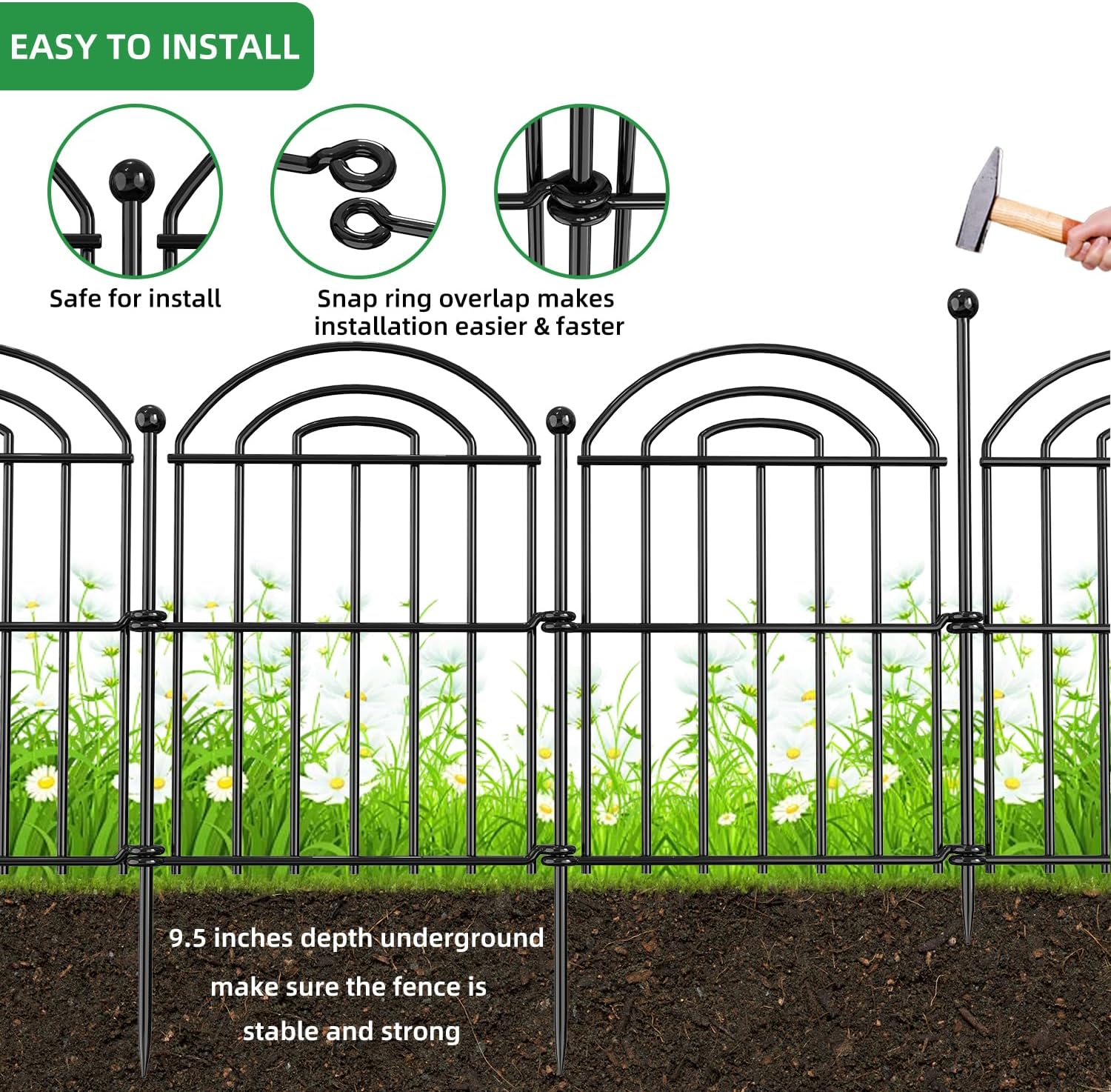 - Size: Single pannel size: 17 in (H) X 13 in (L), total 10 panels size: 17in (H) X 10.8ft (L). You can connect these fences to any shapes you need. The metal fence is also equipped with 11 sturdy 17.7" metal stakes, which can insert into ground 9.5in, keep the fence more stable, and won't be knocked down easily. The fence panels are flexible and can be easily extended and customized to fit your specific landscaping needs.