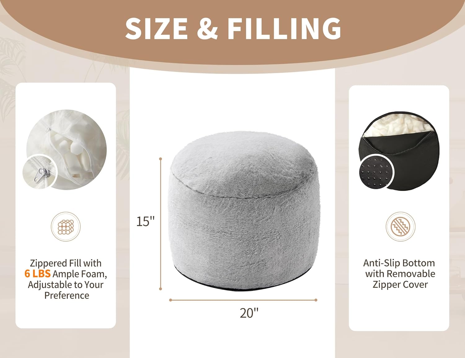 - Boho Pouf Ottoman:Each ottoman pouf foot rest measures 20'*20'*15' inches. The surface of the fur ottoman is made from soft round ottoman covers that extremely soft to the touch and the fluffy ottoman is filled with enough foam to create a full, fluffy shape.