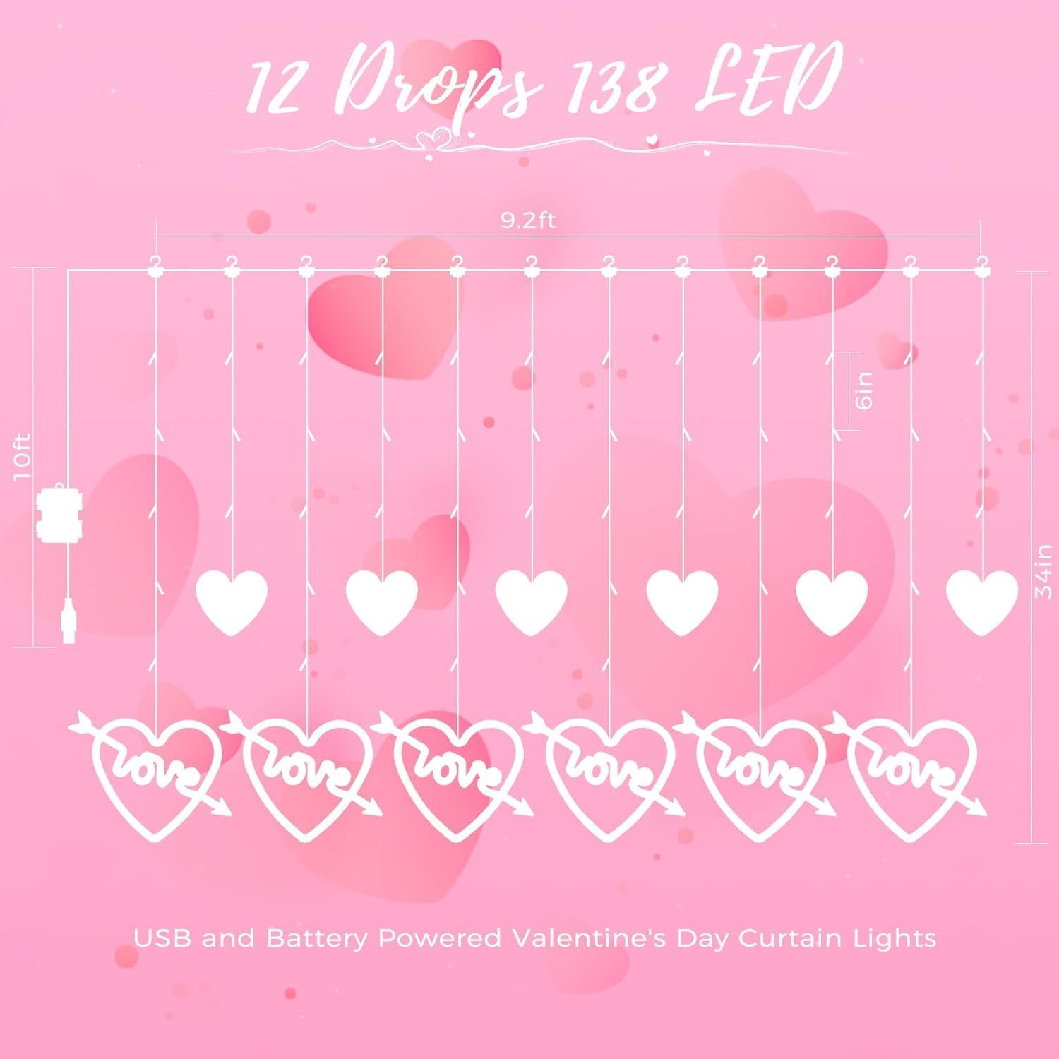 - Valentines Day Window Curtain Lights : Love heart window curtain lights with 138 Led, 12 Love Heart ornaments, 6 big love heart lights and 6 small heart lights, exudesing a soft and charming light, creating a romantic evening atmosphere for you
