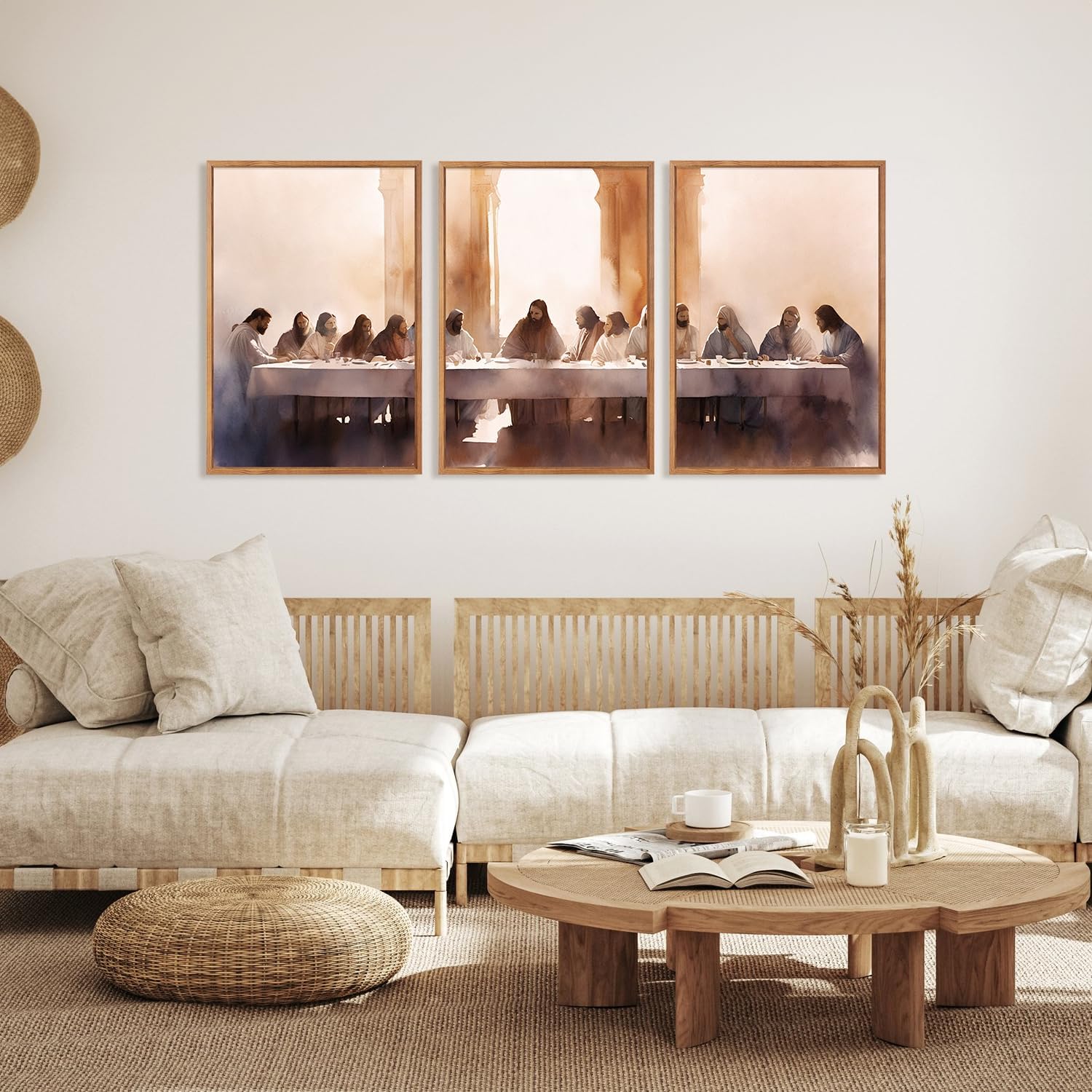 - The Last Supper Wall Decor-- Aurlan Jesus canvas artwork is a 3-piece wall art of the famous religious scene of The Last Supper. The overall tone of the painting is soft, predominantly warm tones, giving people a sense of warmth and solemnity.