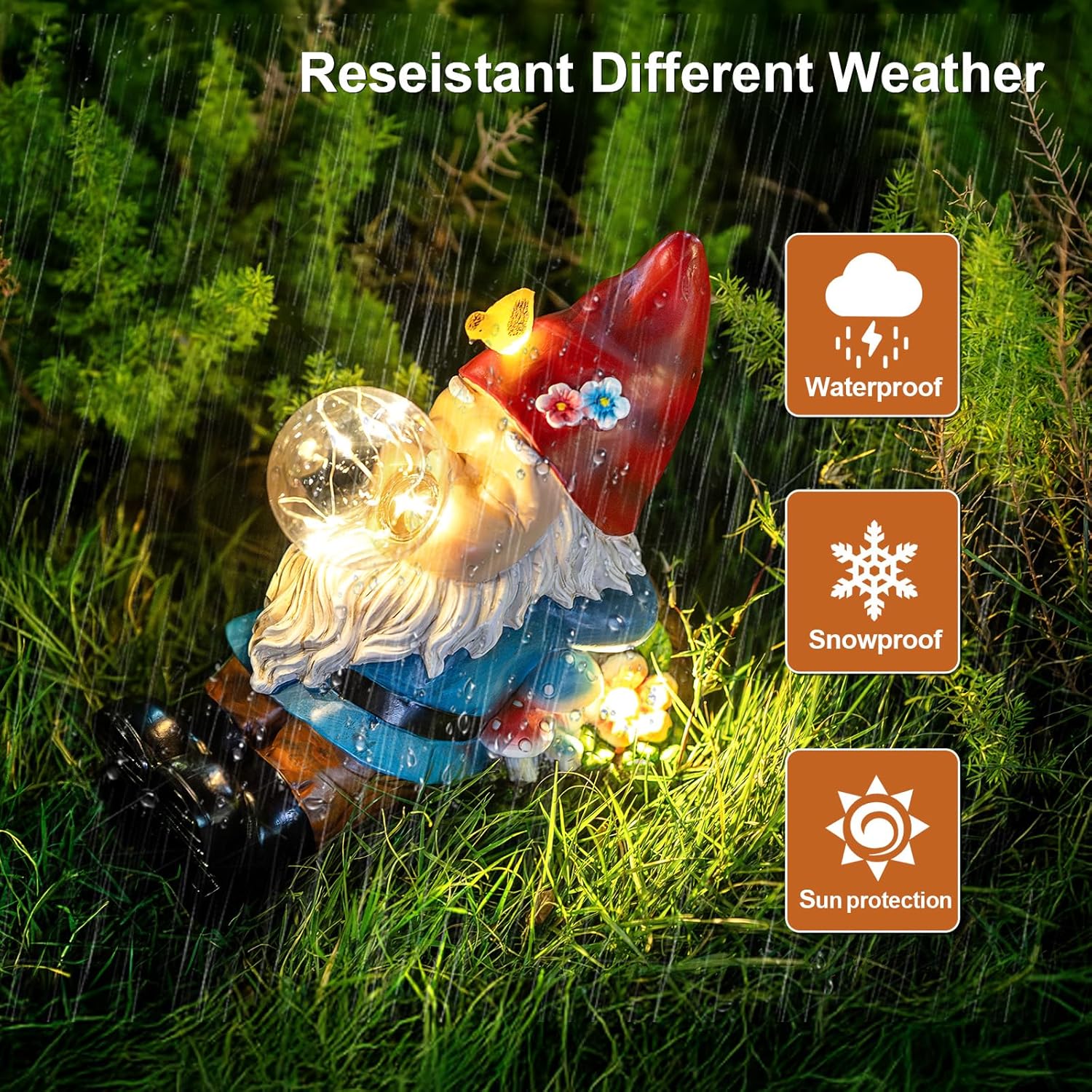 - ☔【Great Material & Weather Proof】Garden gnome decorative lights will accompany you for a long time and give you a lot of fun. Our fairy garden accessories yard decor are made of high quality resin material, waterproof, cracking and fade resistant could work well even in heavy rain or snowstorms.
