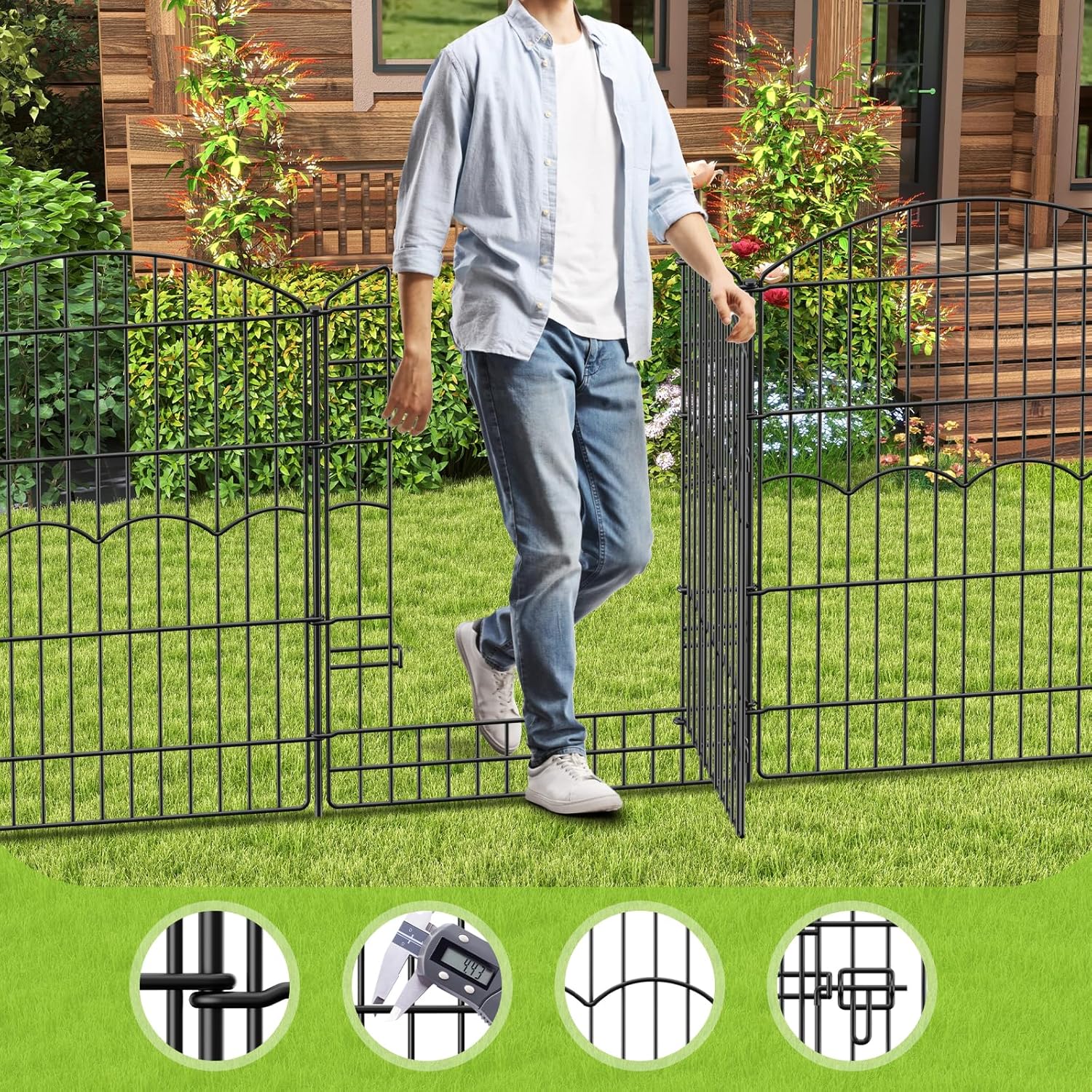 - Fence Size: Each garden fence panel measures 28.3"W x 38"H with a 1.45" gap, while the 13 metal stakes are 0.39" in diameter and 41.3" tall (8.6" into the soil) for secure anchoring in the ground. The removable fence includes 11 panels + 1 gate, connecting 12 panels, with a total length of 29.6 feet. The no-digging fence can be added or removed freely, giving you complete flexibility to customize your area.