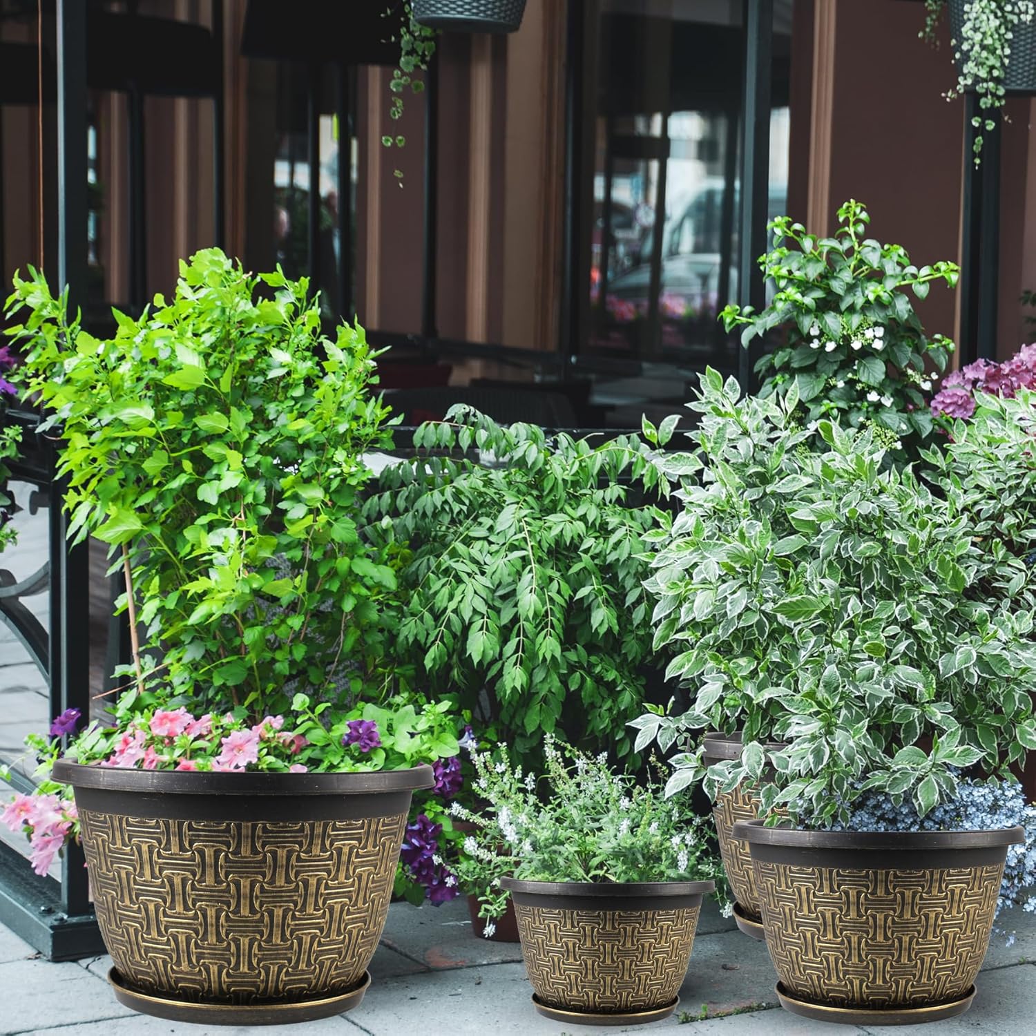 4 Pack 12 Inch Plant Pots,Large-Plant-Flower-Planters-Plastic, Flower Pots Outdoor Indoor with Drainage Holes & Trays, Retro Antique Imitation Decorative Garden Sets for Houseplants