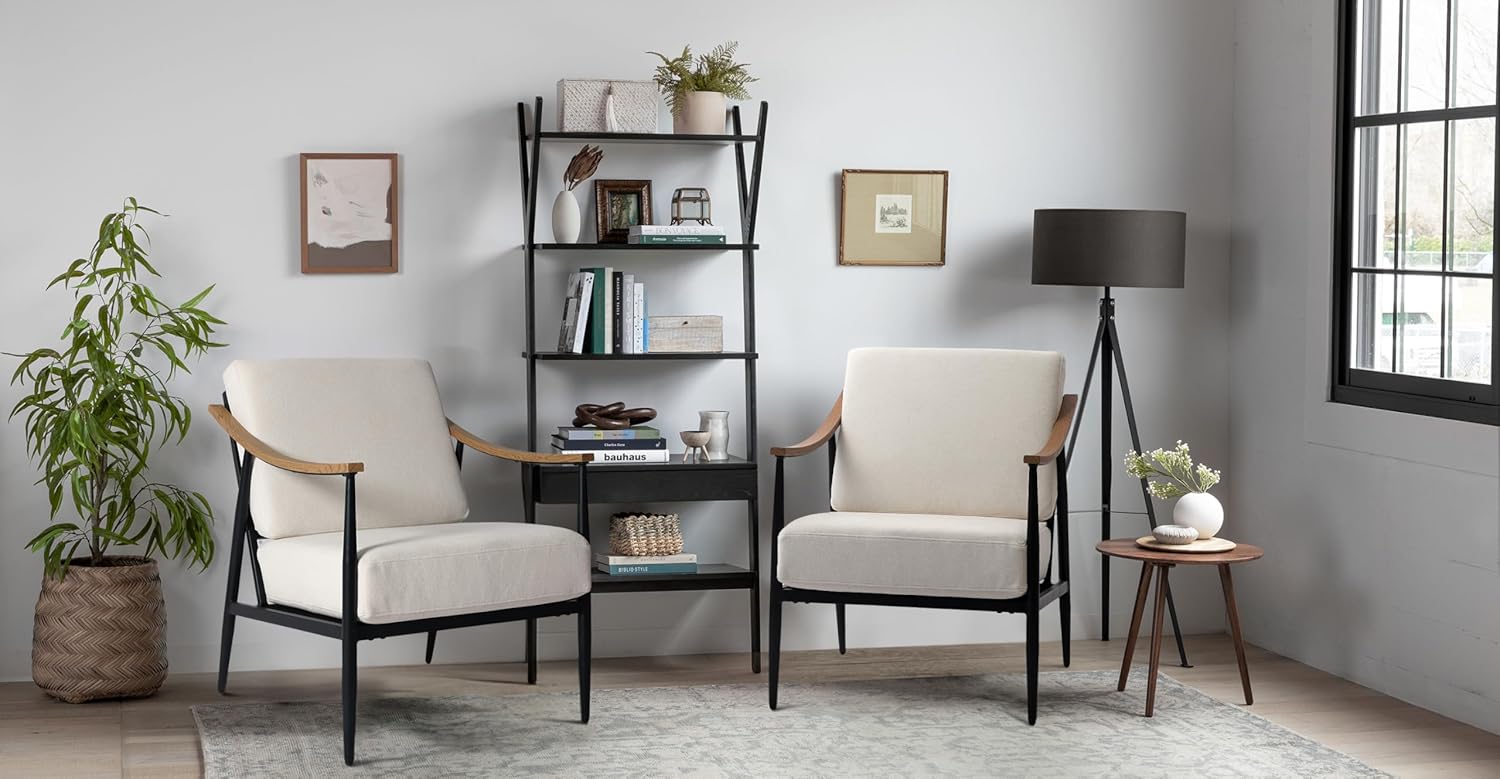 - Please Your Eyes - Designed in a unique mid-century modern style, the curved imitation wood-grain METAL armrests provide a unique and stylish look, while the solid metal frame and linen fabric add a modern touch. With a sleek and modern design that incorporates retro elements, this accent chair will add a touch of sophistication to any room