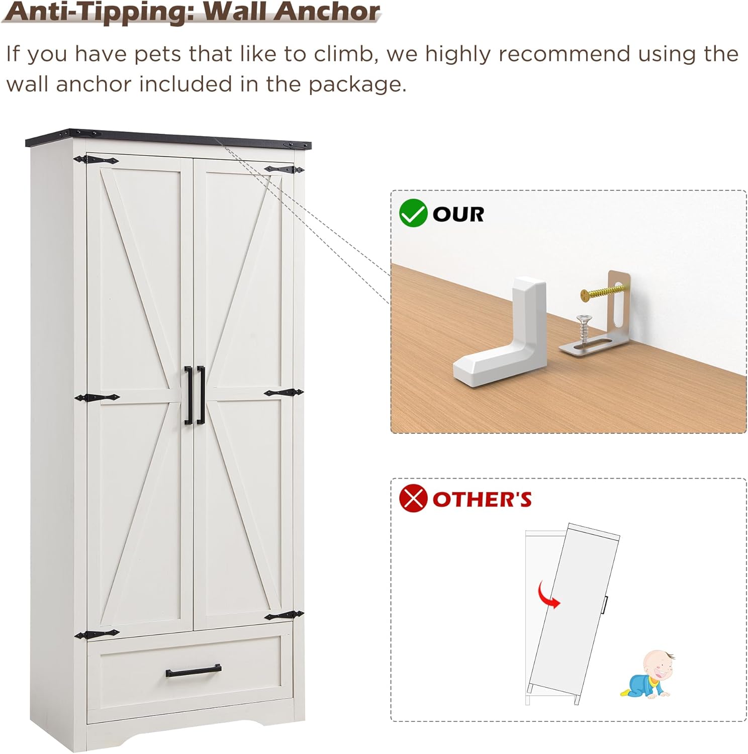 - Sturdy and Safe Design: Crafted from high-quality engineered wood and metal, this cabinet is built for stability and longevity. It includes an anti-tip safety kit for secure wall mounting, ensuring stability even in households with pets. Enjoy peace of mind knowing your family’s safety is a priority