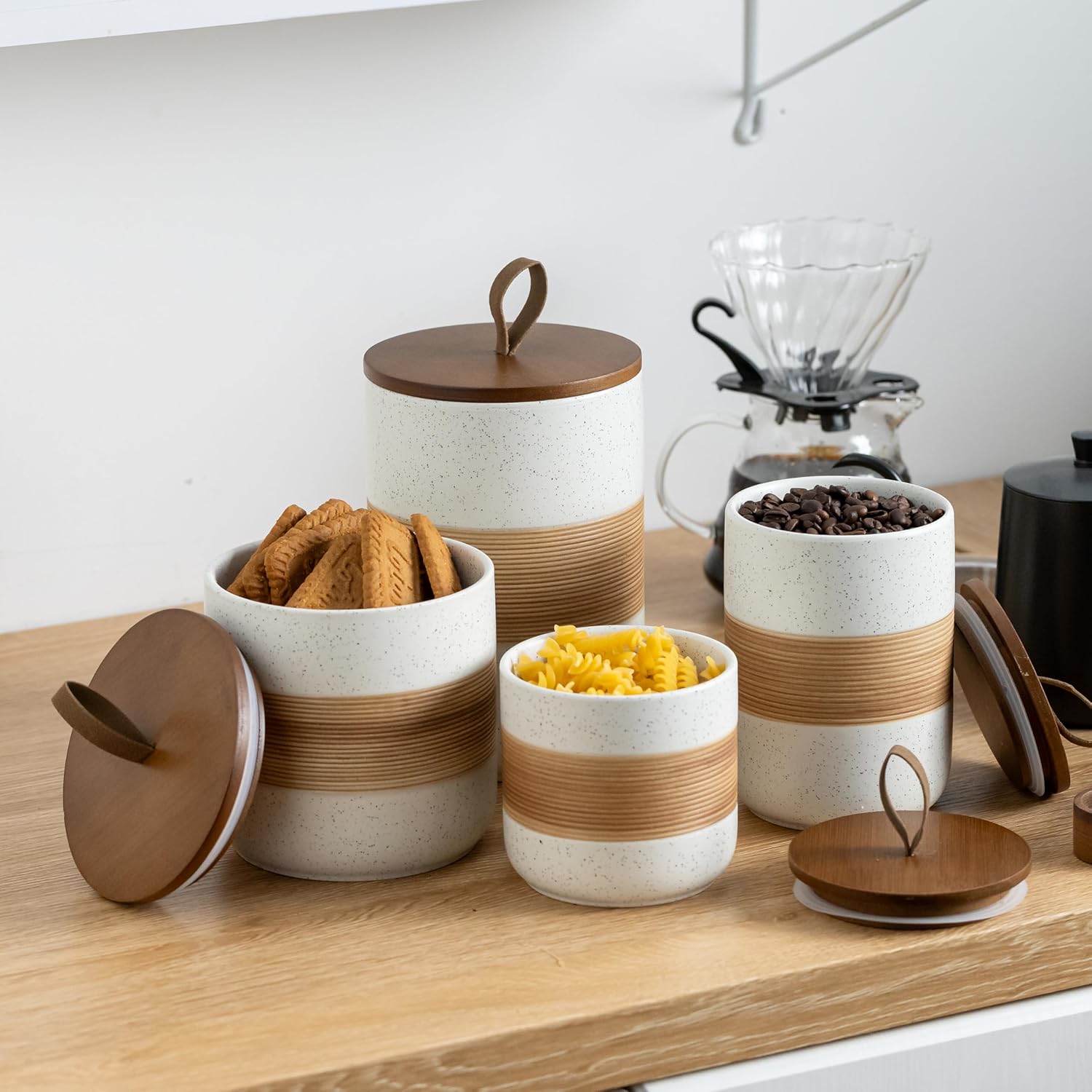 - Rope Cover Design: Each food storage container is equipped with a wooden lid, which has strong sealing and effectively isolates air, moisture, and odors, keeping food dry and fresh, and extending the shelf life of food. There is a unique rope design on the lid, which is easy to open without losing its beauty