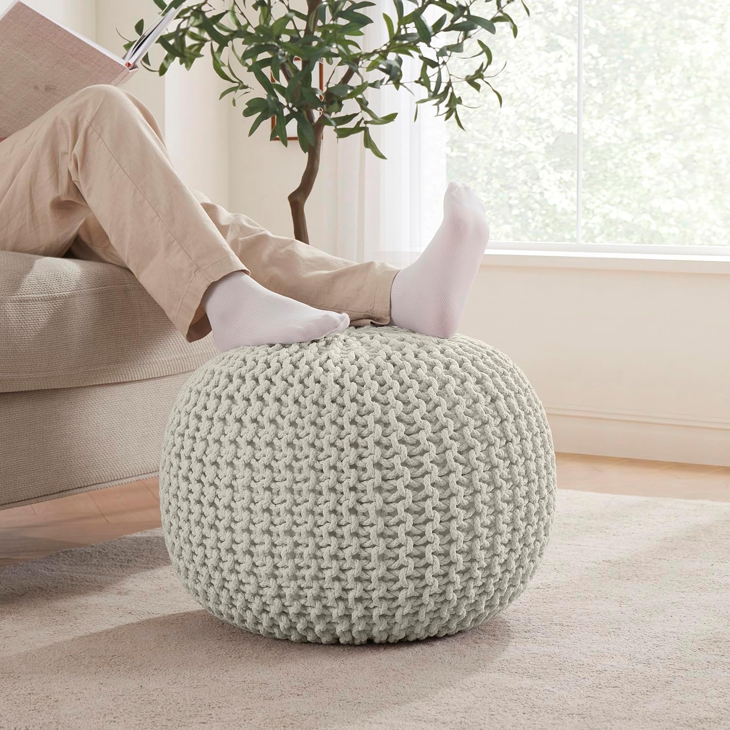 Ornavo Home Pouf Ottoman Foot Rest - 100% Cotton Pouffe - Hand Knitted Cable Braid Cord - Boho Round Stuffed Ottoman for Living Room, Bedroom - Natural