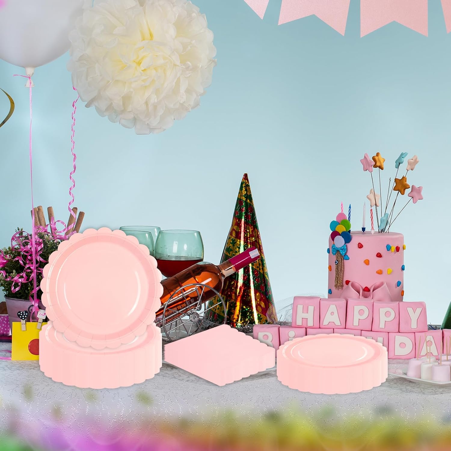 - Complete Set: Enjoy a hassle-free party with our 50 pcs pink scalloped paper plates party supplies set that includes9 inch 20 pcs dessert plates & 20 pcs napkins.Perfect for any party or everyday use, enough to decorate a fabulous and unique party!