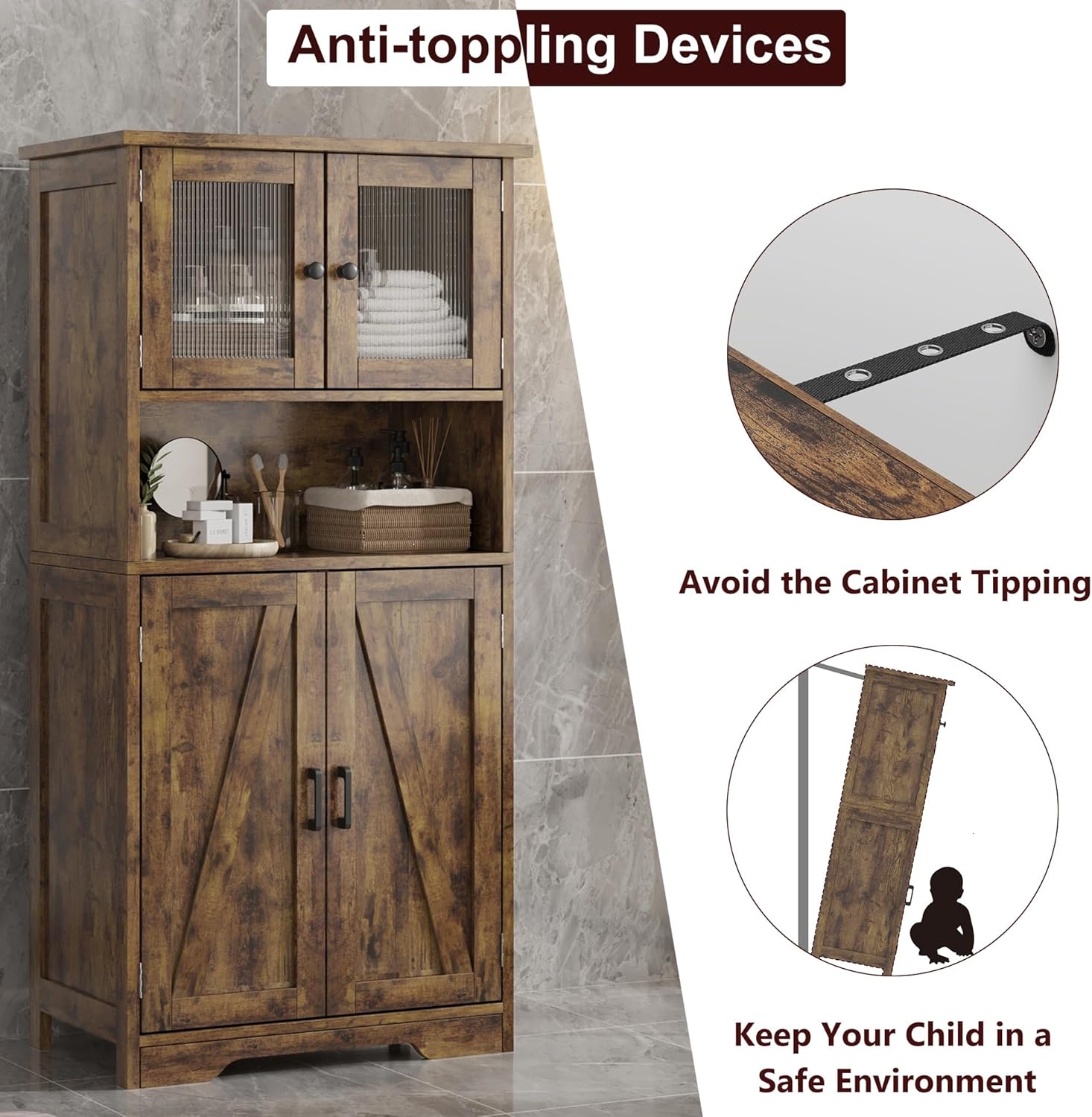 GarveeHome 54in Tall Bathroom Cabinet, Farmhouse Storage Cabinet with Glass Doors and Adjustable Shelves, Freestanding Kitchen Pantry Cabinets, Cupboard for Living Room, Dining Room, Rustic Brown