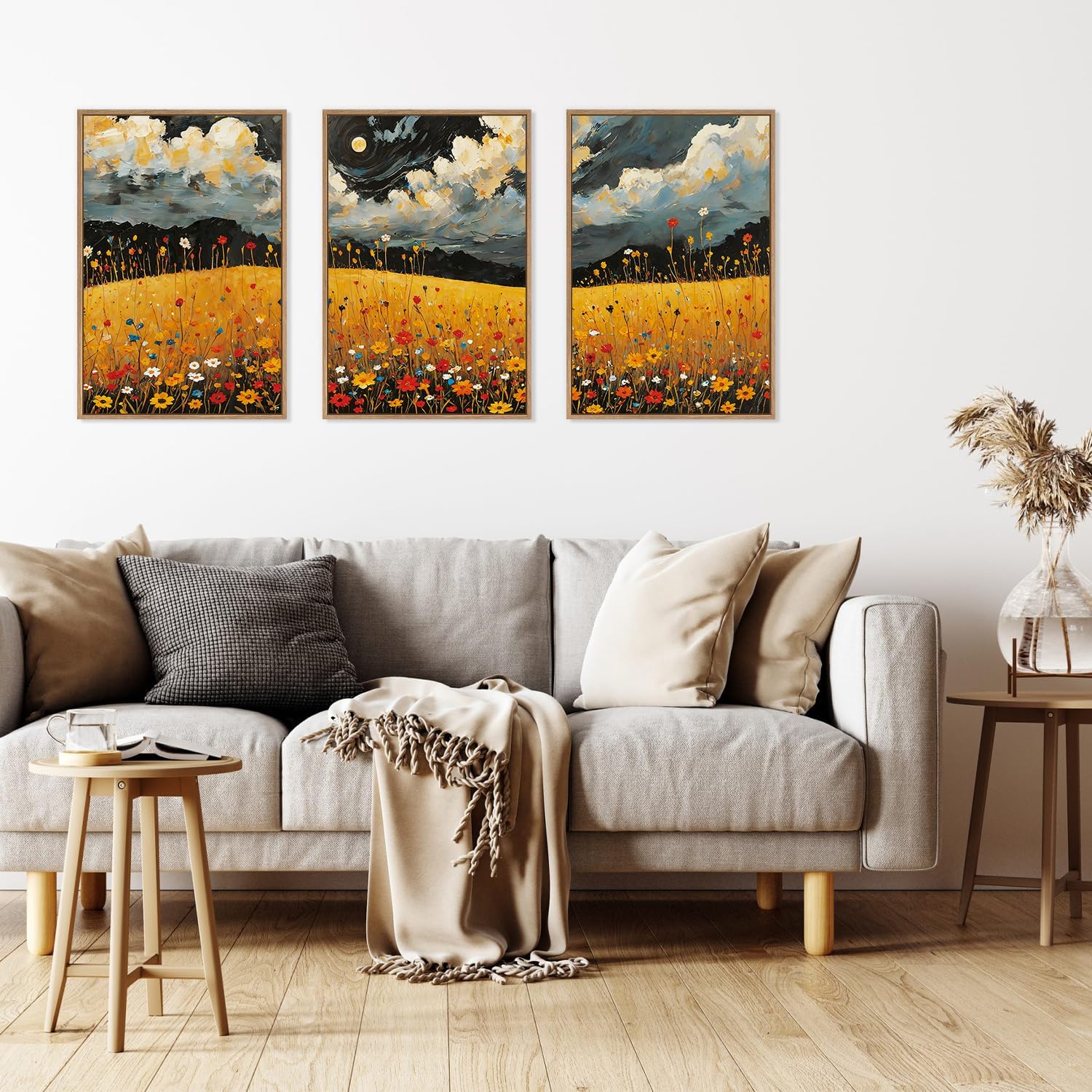 - Mystical Moonlight Framed Wall Art Set: The Full Moon Mountain Floral Art Print features a captivating natural style that blends celestial beauty with natural charm in a mesmerizing way. The overall depiction of a field of golden yellow flowers dotted with red, yellow, blue and white blossoms, with a changing and swirling sky in the background, is highly mystical. With vibrant colors and contrasts, this piece is full of life and energy and can add an artistic touch to an interior space.