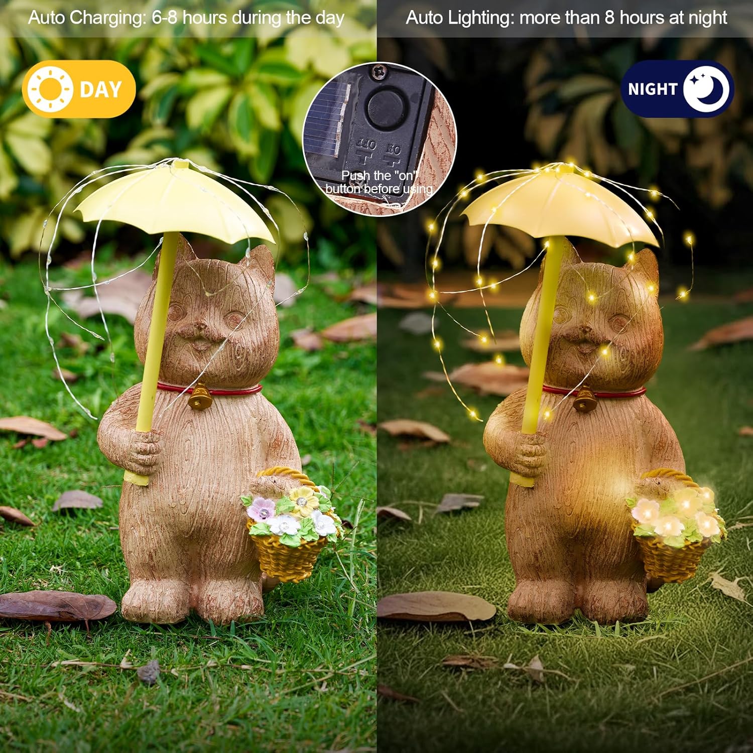 - [Charming Solar Garden Lights] This solar garden cat statue features a kitten holding a flower basket and an umbrella, beautifully illuminated by solar lights nestled inside the basket and string lights cascading from the umbrella top. Perfect for garden decor, patio decor, outdoor decor, front porch decor, and fairy decor lovers