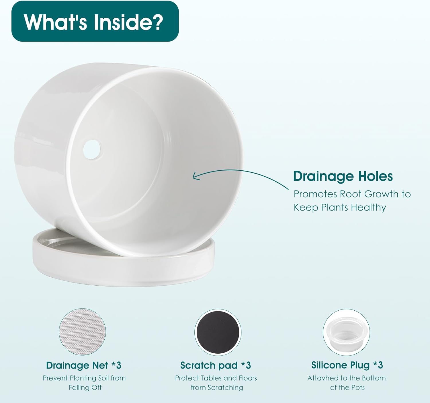 - 【Drainage Holes and Trays】This plant pots indoor with drainage paired with leak-proof mesh pads to efficiently remove excess water, prevent soil loss, and avoid waterlogging. The tray collects drained moisture, keeping surfaces dry, while the design promotes healthy root growth—ideal for flowers, pothos, monstera, africa violet, snake plant ,money tree and small tree sapling, etc (Note: Tray is attached to the bottom; plant is not included.)