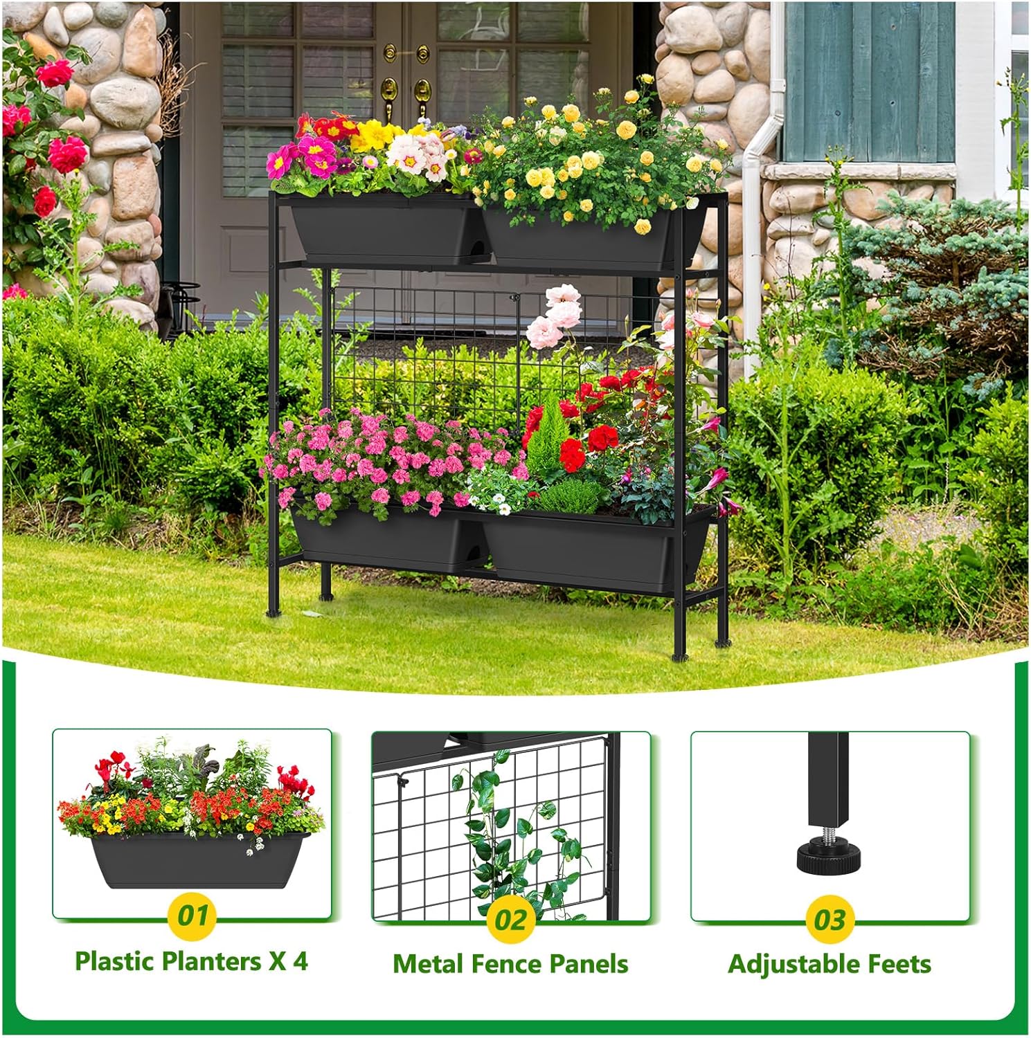 - 【Metal Fence Panels】Compared with other raised beds for gardening outdoor, our raised garden bed with trellis has extra metal mesh fences. These metal fences also contribute significantly to the structural integrity of the raised garden beds outdoor. Protecting your precious herbs, flowers, and vegetables from being damaged. Metal fences also support structures for small climbing plants and hanging planters, further enhancing the overall visual feeling.