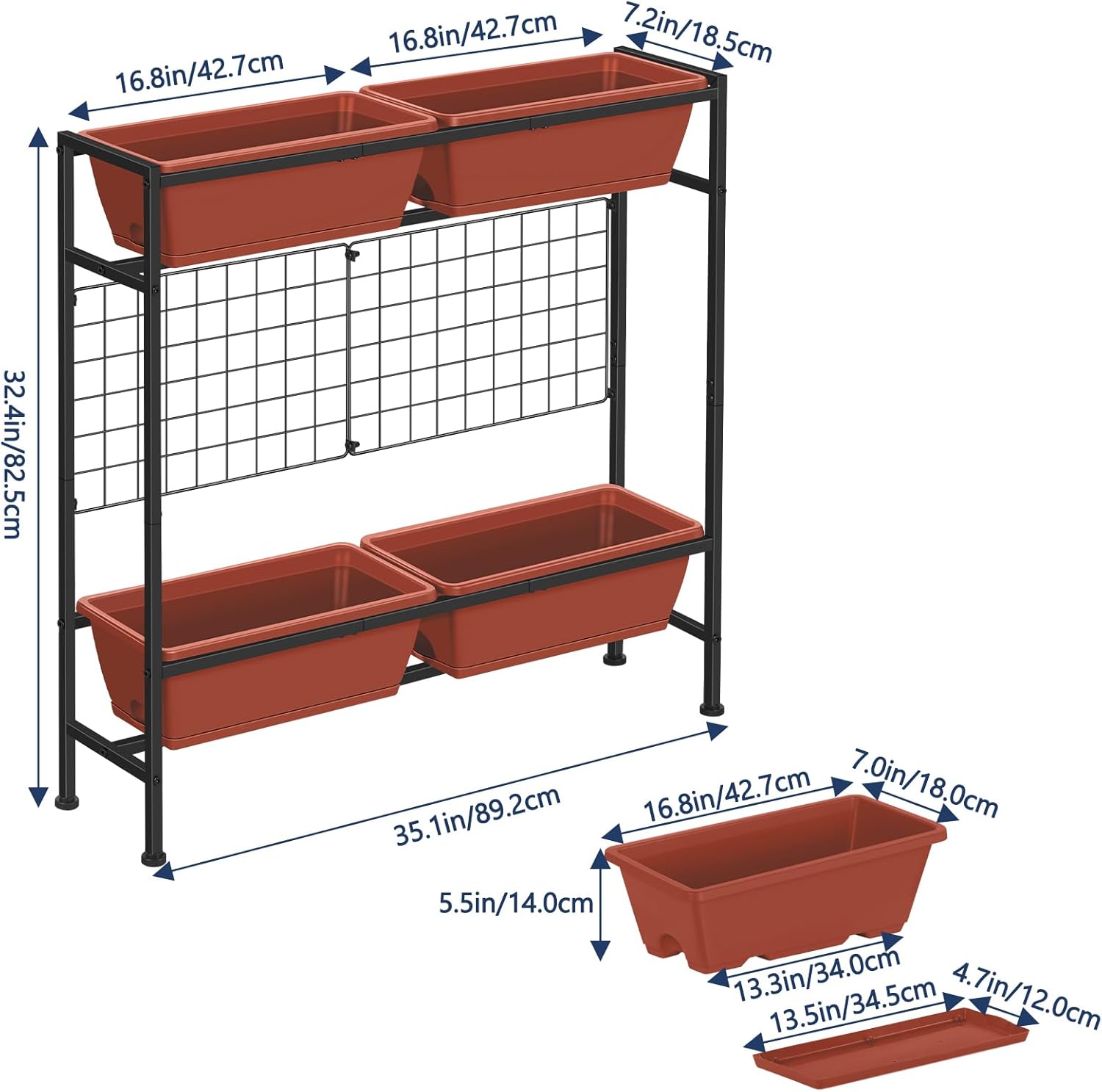 - 【32.4" Tall Planter Boxes with Trellis】Product Dimensions: 7.2"D x 35.1"W x 32.4"H. Each plastic raised beds for gardening measures 7"D x 16.8"W x 5.5"H with a bottom size of 13.5 x 4.7 inches. This vertical design of herb garden planter outdoor is perfect for those with limited horizontal space, such as small balconies, patios, or even indoors near a window. Standing at 32.4 inches tall, the raised garden beds outdoor maximizes vertical space, allowing you to grow a diverse range of plants without taking up too much floor area.