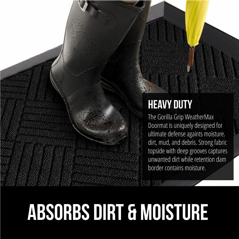 • THE ORIGINAL WEATHERMAX ALL SEASON DOORMAT: Gorilla Grip's Original WeatherMax doormat is built tough with a heavy duty, yet soft and flexible construction; deep grooves, beveled rubber border and retention dam help capture dirt, debris and moisture
