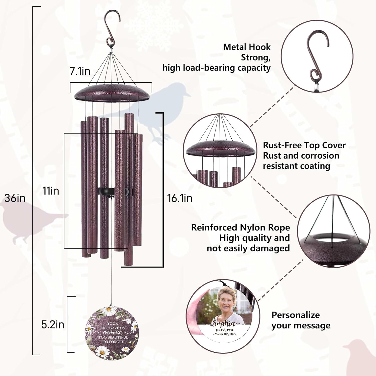 - A BETTER CHOICE THAN FLOWERS: Personalized memorial wind chimes, customized with his/her name and date to keep love in our hearts forever. Our wind chimes are tuned by wind chime experts to crash out beautiful music, a better tribute gift than flowers.