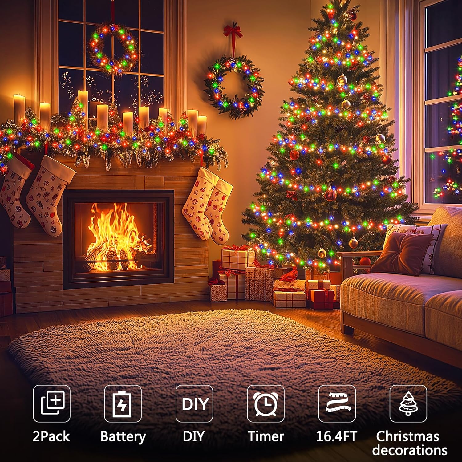 2 Pack Christmas Fairy Lights Battery Operated, 16.4FT 50 LED Dark Green Wire Micro Starry Twinkle Light with Auto Timer Waterproof, Indoor String Lights for Indoor Outdoor Yard Decor (Multicolor)