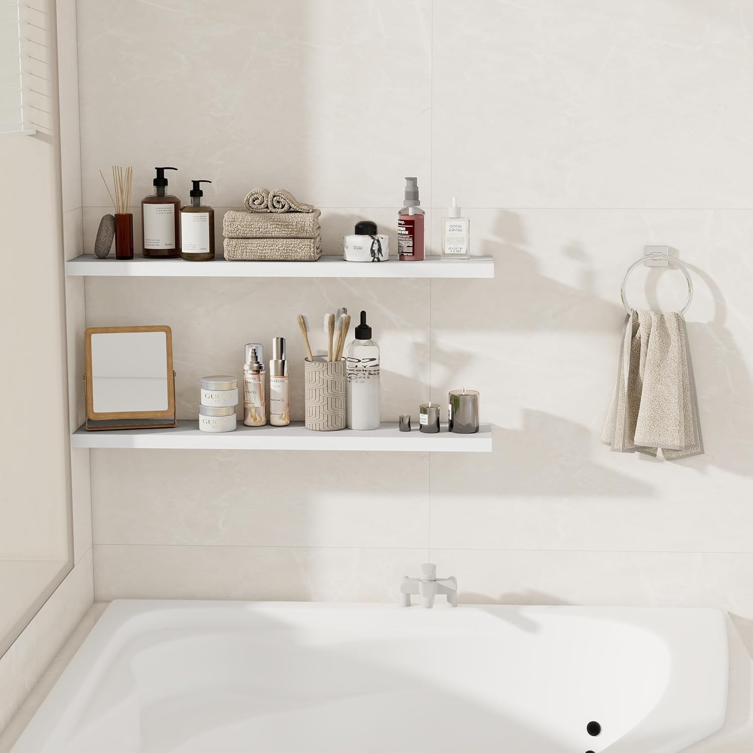 Fun Memories 36Inch Floating Shelves for Wall 2 Pack Wood Shelves for Kitchen, Bathroom, Bedroom Wall Mounted Rustic Wood Floating Shelf with Invisible Brackets for Books, Storage, Decor, White