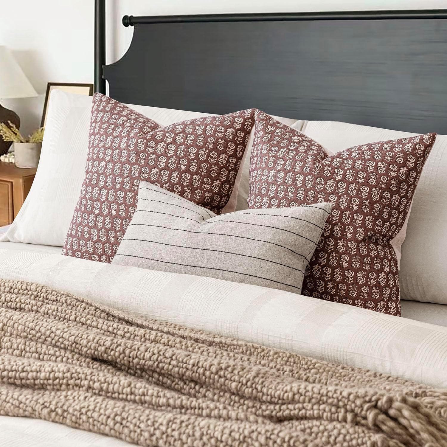 Foindtower Set of 2 Decorative Vintage Floral Print Throw Pillow Covers Neutral Modern Farmhouse Cushion Covers Boho Home Decor for Sofa Couch Chair Bedroom Living Room Outdoor,24×24 Inch,Wine Red