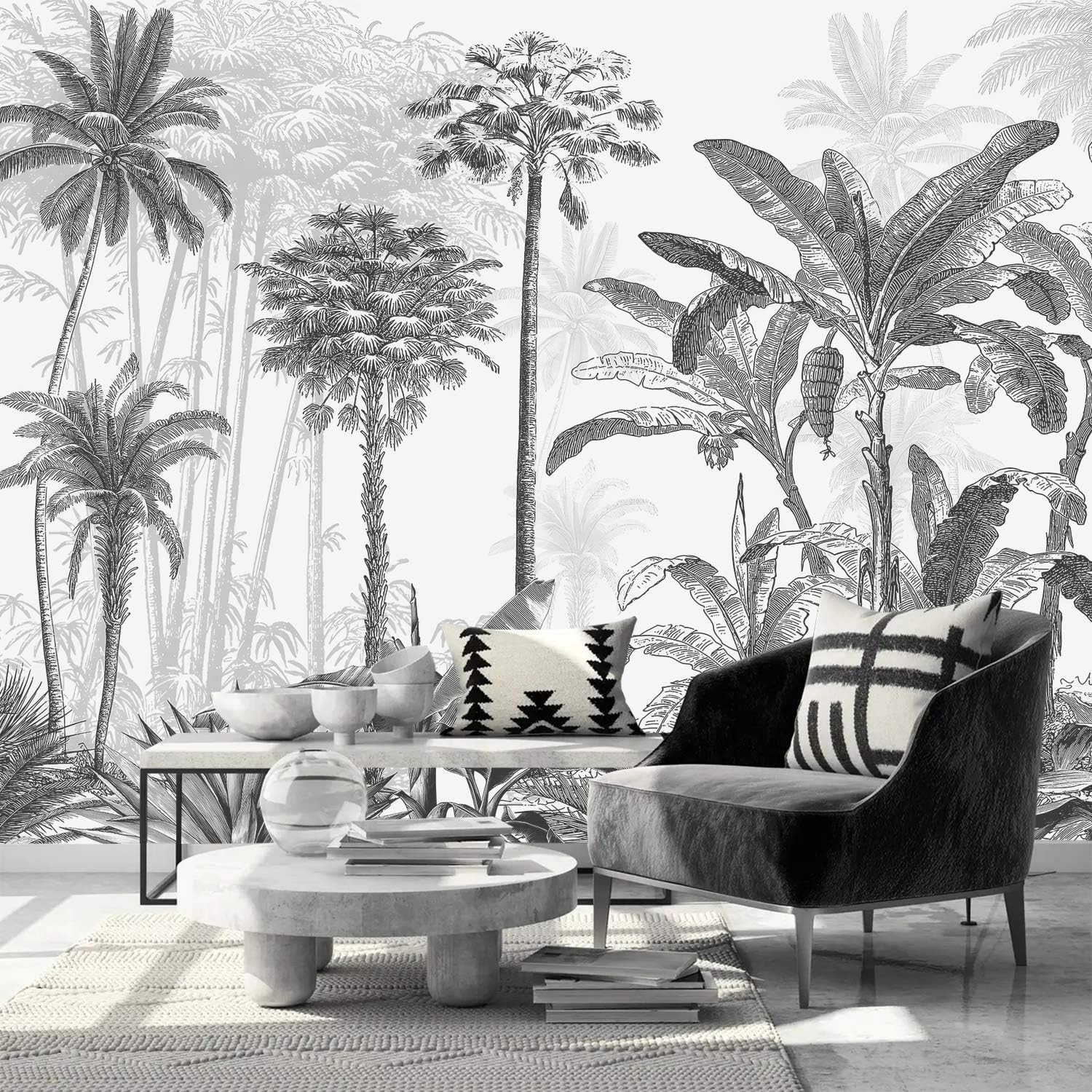 AFZEVEB-Black and White Jungle Wallpaper Hand-Painted Tree Wall murals for Bedroom 159"x107" (Not Peel and Stick)