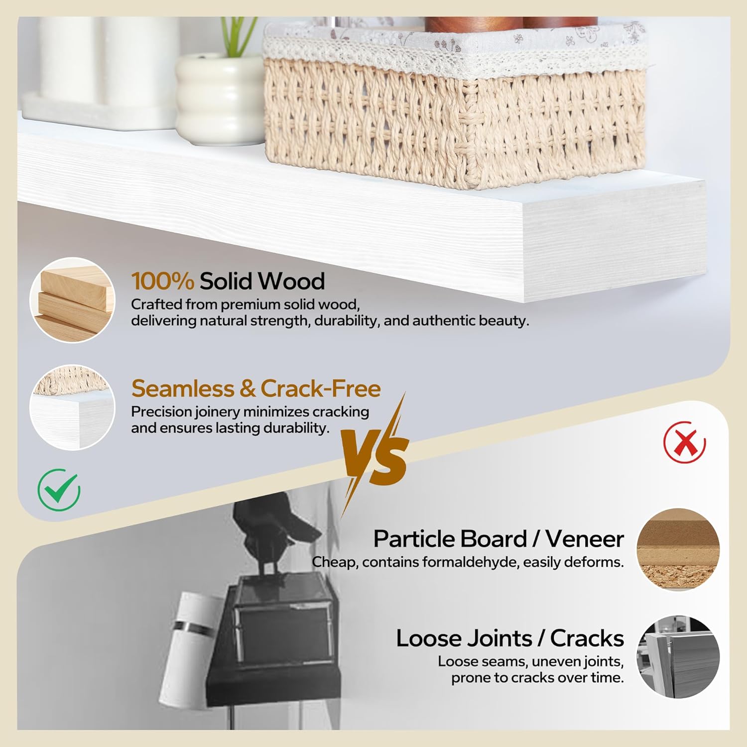 Floating Shelves 3 inch Thick for Wall Set of 2,Solid Pine Wood Wall Mount Shelf for Kitchen Living Room Bedroom Bathroom,8" D x 36" L x 3" H-White