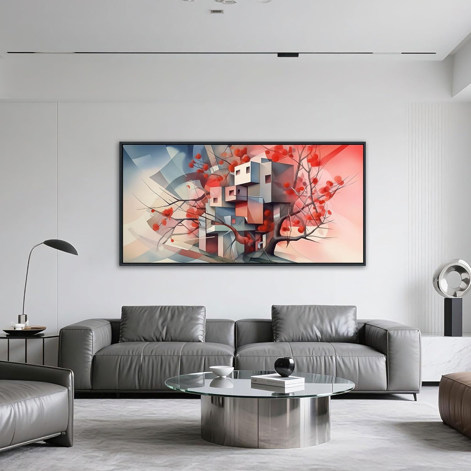 - Innovative Artistic Style: This canvas wall art blends geometric and natural motifs, merging abstract wall art with vibrant red blooms for striking contrast. Ideal as large wall art for living room or office wall art, its bold hues and modern design elevate paintings wall decor or modern wall art collections.