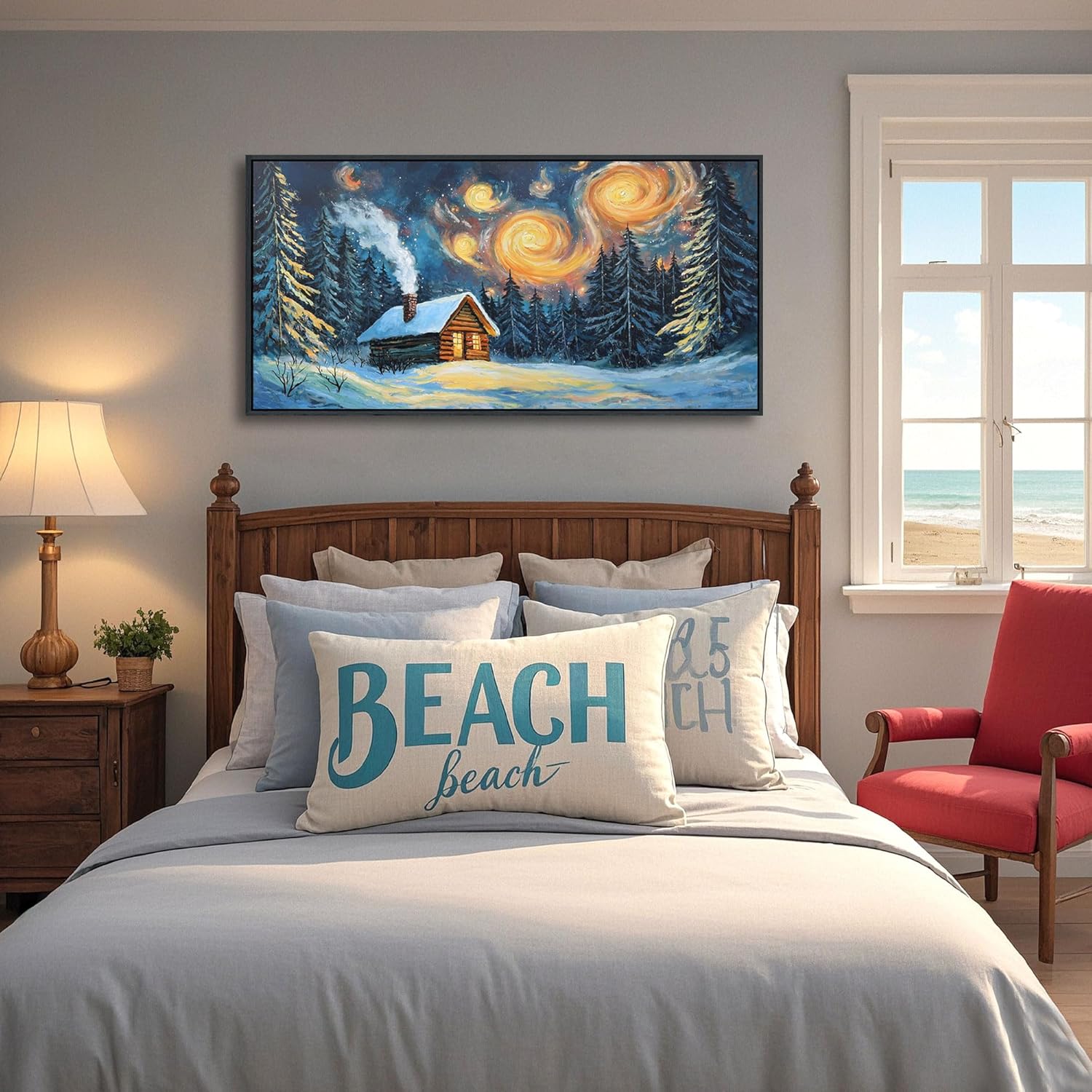 - Large Wall Art for Living Room : This framed canvas wall art presents a magical blend of a winter wonderland and a mesmerizing starry sky. The snow-capped cabin amidst tall pine trees, with smoke curling from the chimney, exudes warmth.Its fusion of landscape wall art and abstract elements makes it versatile for modern, rustic, or bedroom wall decor.