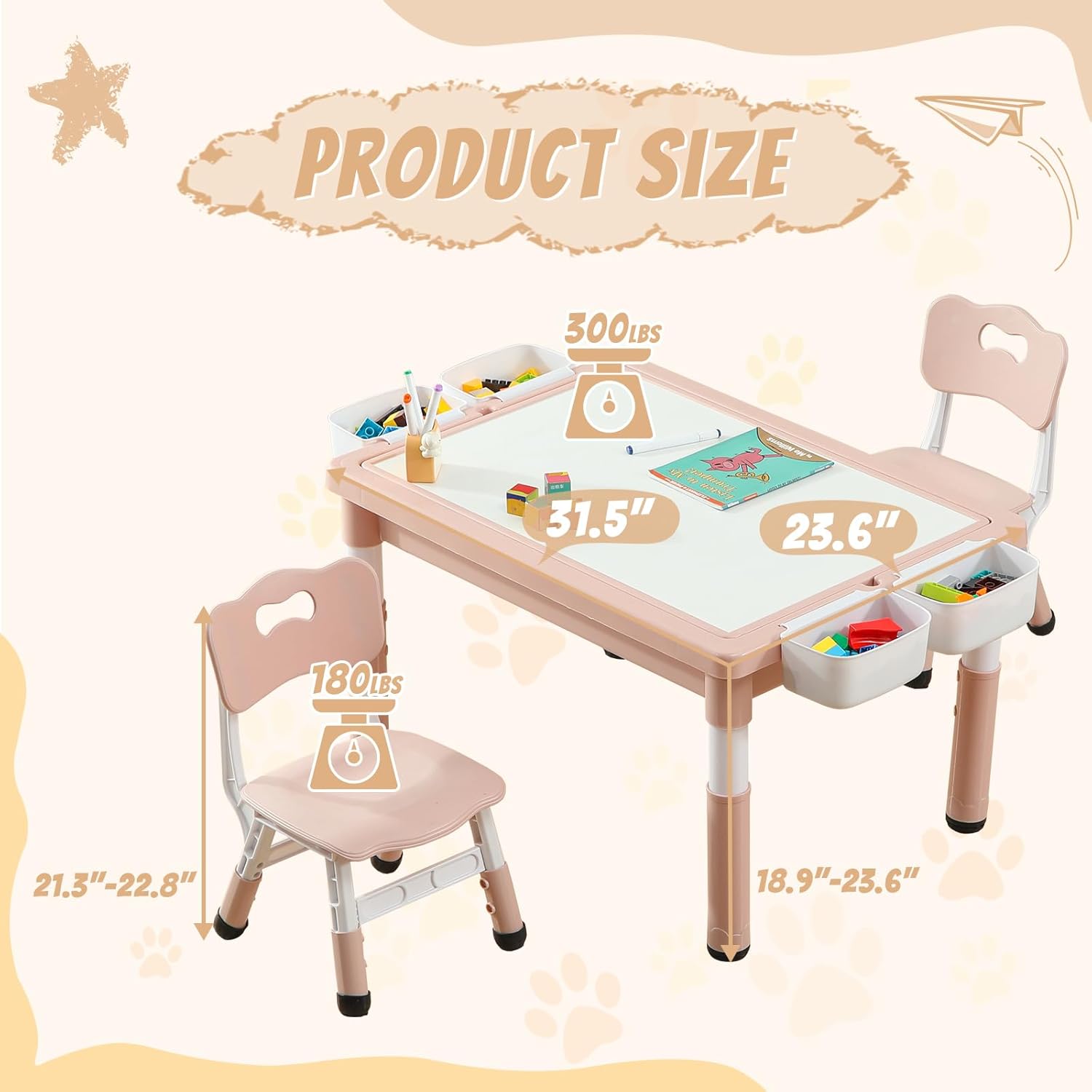 Multi Functional Kids Table and 2 Chairs Set, Graffiti & Building Blocks Double-Sided Tabletop, Toddler Play Table with Drawers, Large Storage Space, Gift for Boys/Girls, Pink
