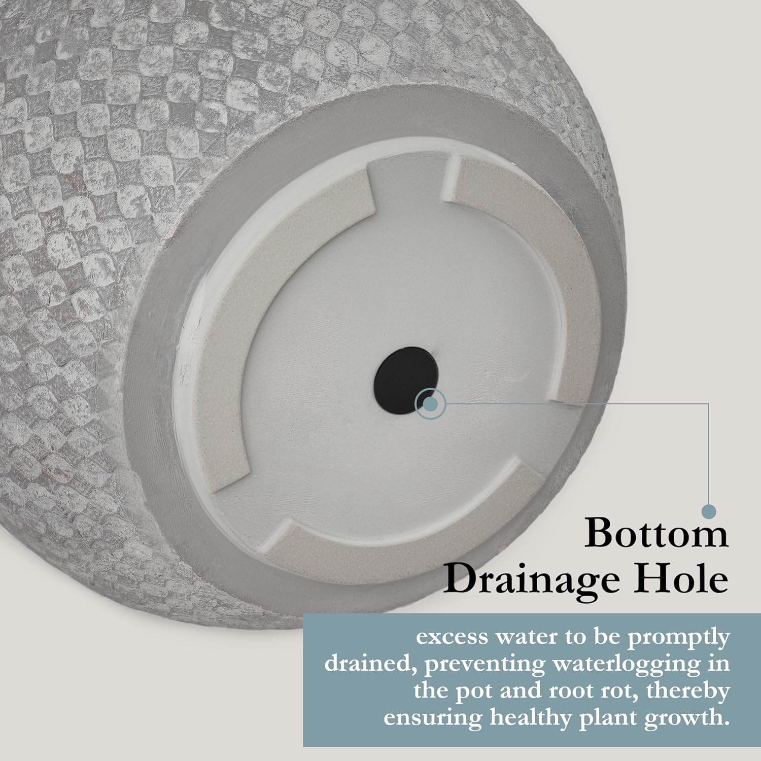 Worth Garden 12" Dia x 15" H Grey Round Planter – Lightweight Magnesium Oxide Cement Plant Pot with Texture – Raised Pattern Concrete Look – Drainage Hole – Indoor & Outdoor Use